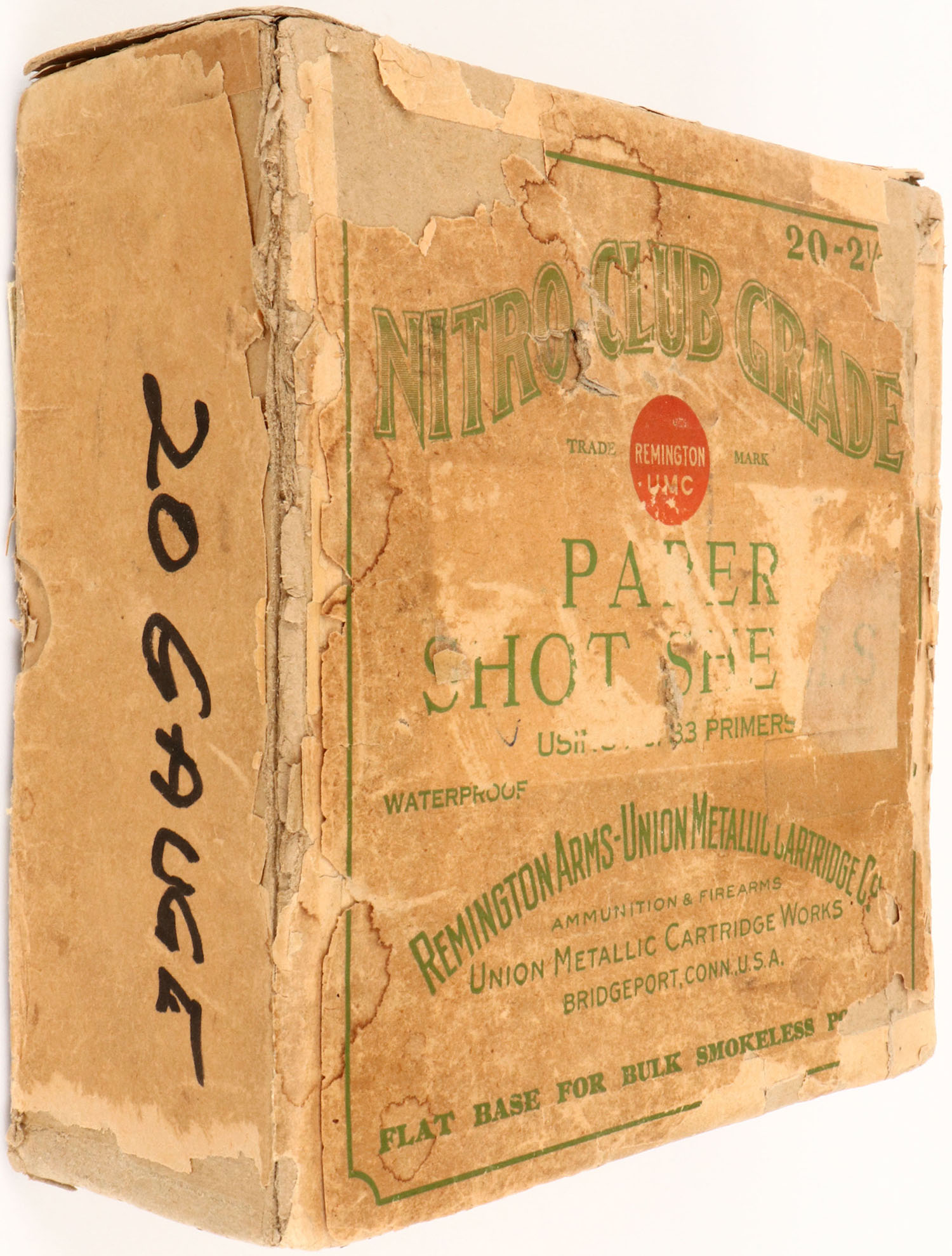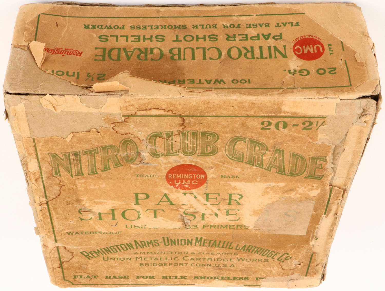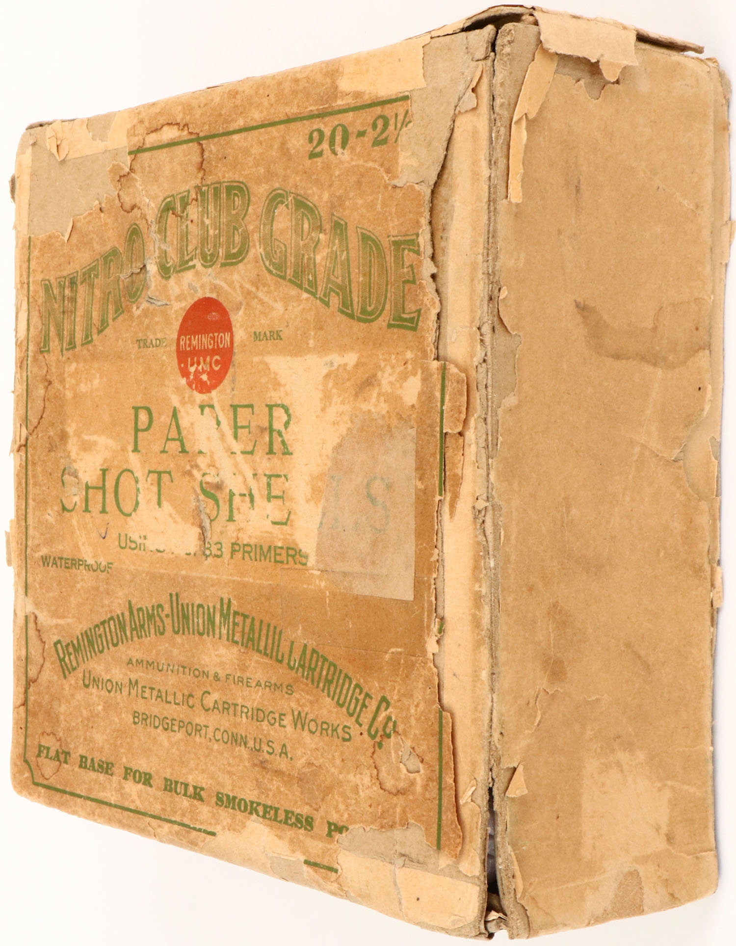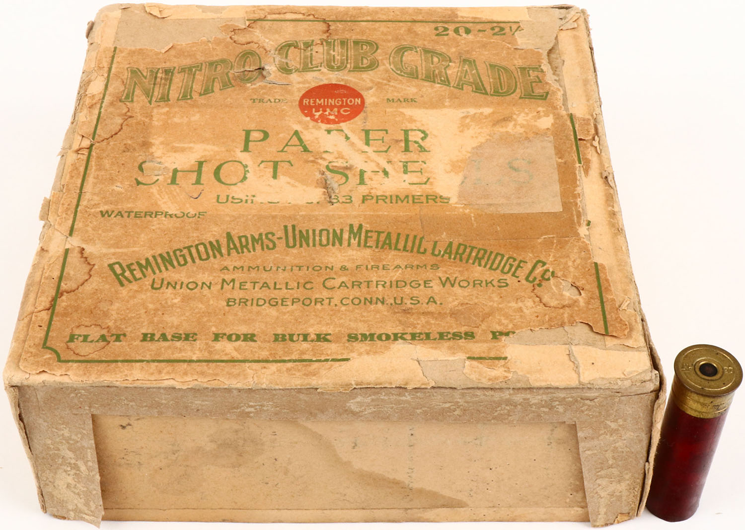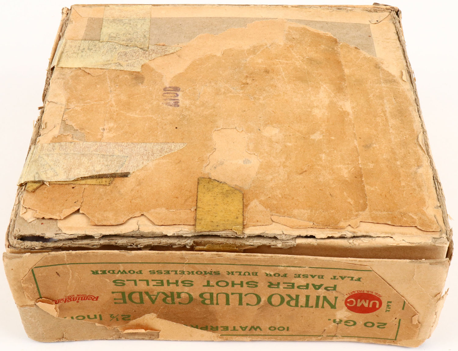 REM-UMC, NITRO CLUB GRADE, 20ga, 2pc., Partial 26rds of NPE, 2 1/2'', buff box with green and buff label, box has edge wear, scuffing, seam splits, tape repair, light soiling & label is 73% intact. Shells are very good. Grade: Very Good + - Value: 100 to 300