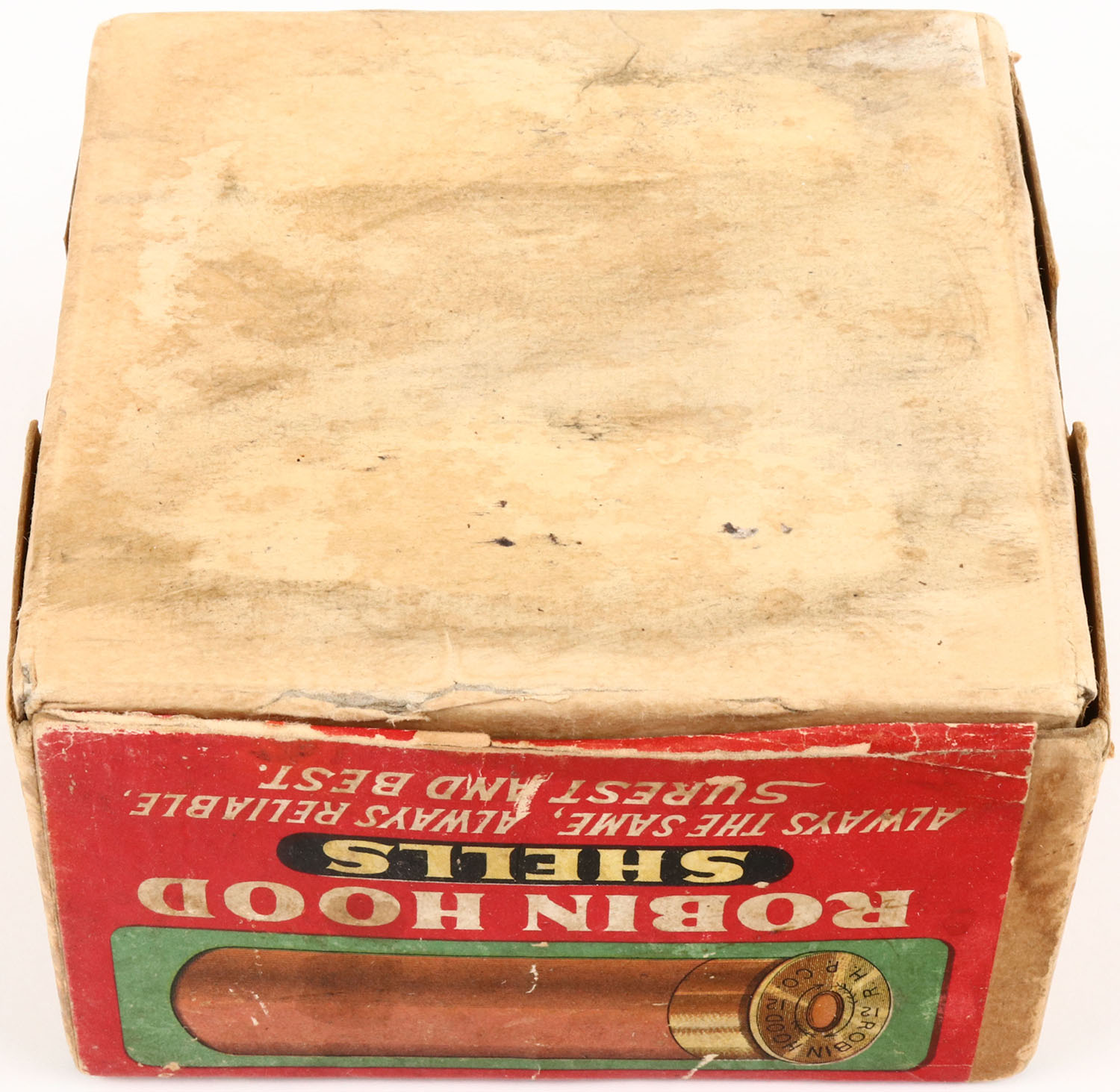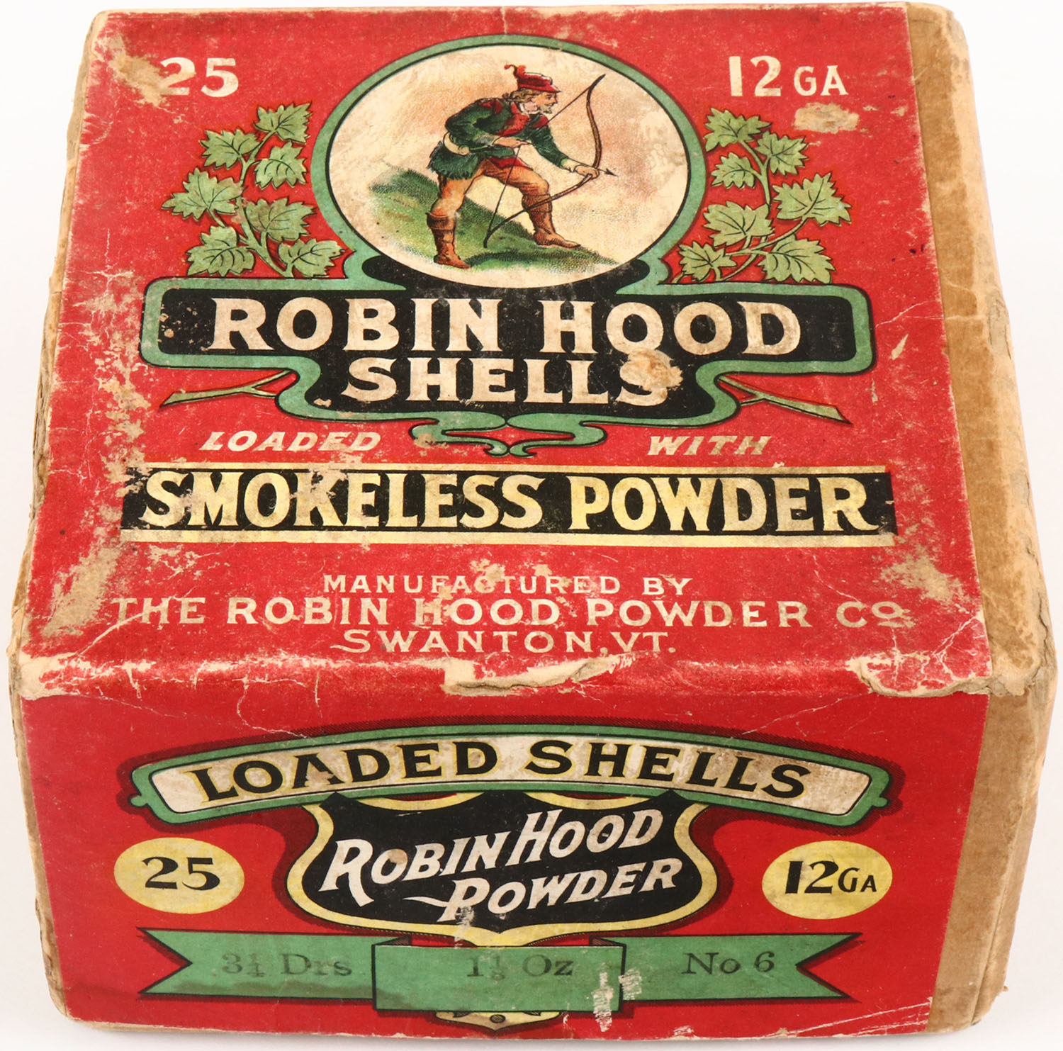 The Robin Hood Powder Co., SMOKELESS POWDER, 12ga., 2pc., Empty, shot size 6, buff box with red, white & black label that pictures a multi colored Robin Hood, Loading: 3 1/4 DRS., 1 1/8 Oz. No. 6, box is solid with seam split & one glue repair, label has very good colors, all original label with bottom label missing.* Grade: Very Good ++ - Value: 1000 to 5000