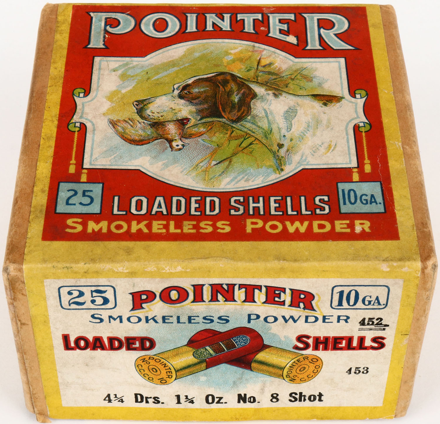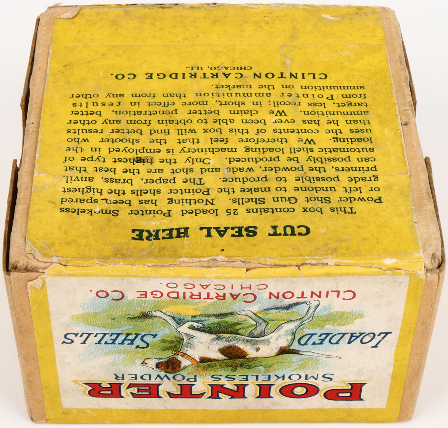 CLINTON Cartridge Co., POINTER, 10ga., 2pc., Empty, shot size 8, buff box with multi-colored label of a dog holding a quail, box has great color with light age soiling, sides picture crossed shells & a dog on point. Grade: Excellent + - Value: 200 to 800