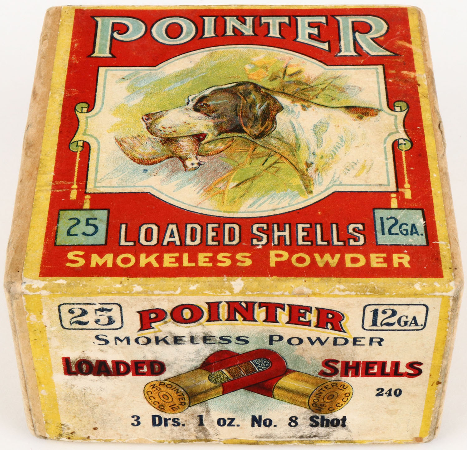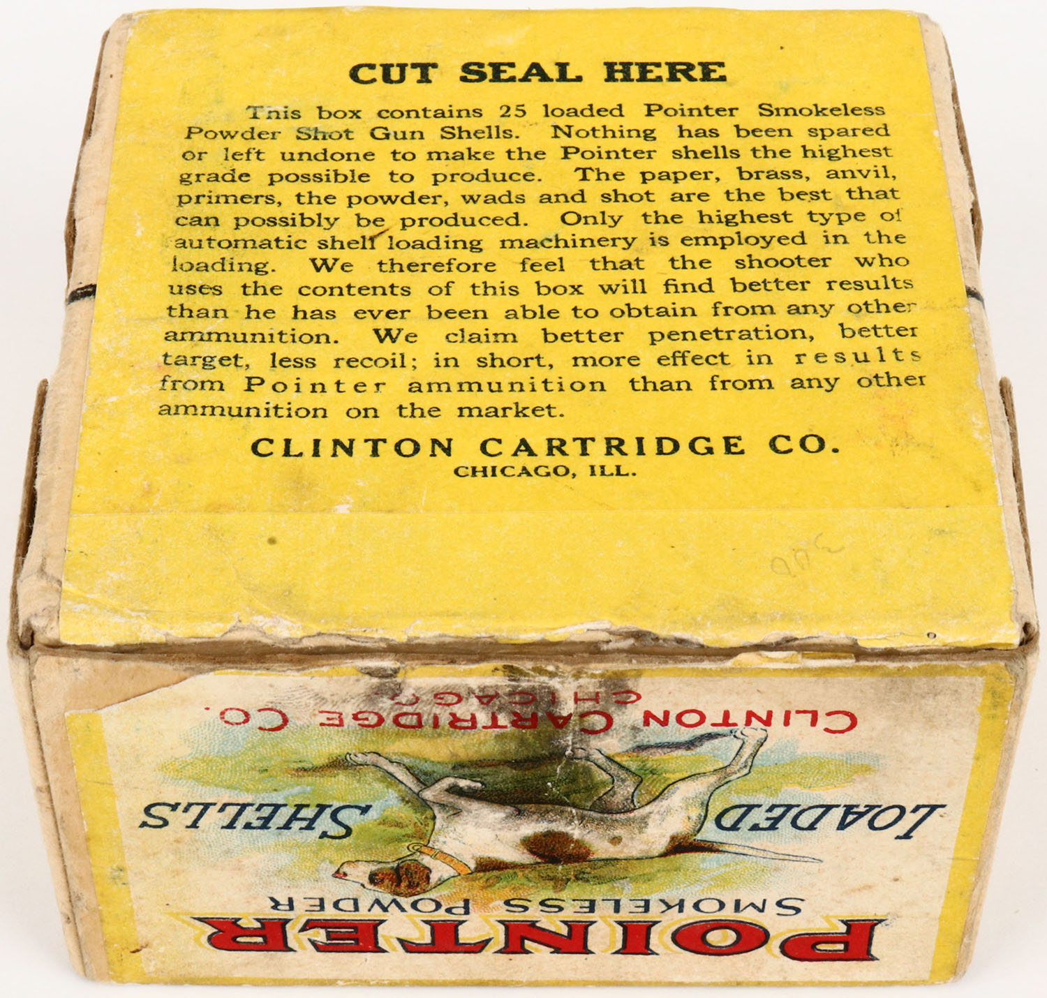 CLINTON Cartridge Co., POINTER, 12ga., 2pc., Empty, shot size 8, buff box with multi-colored label of a dog holding a quail, box has great color with light age soiling, small seam split, sides picture crossed shells & a dog on point. Grade: Excellent + - Value: 200 to 600