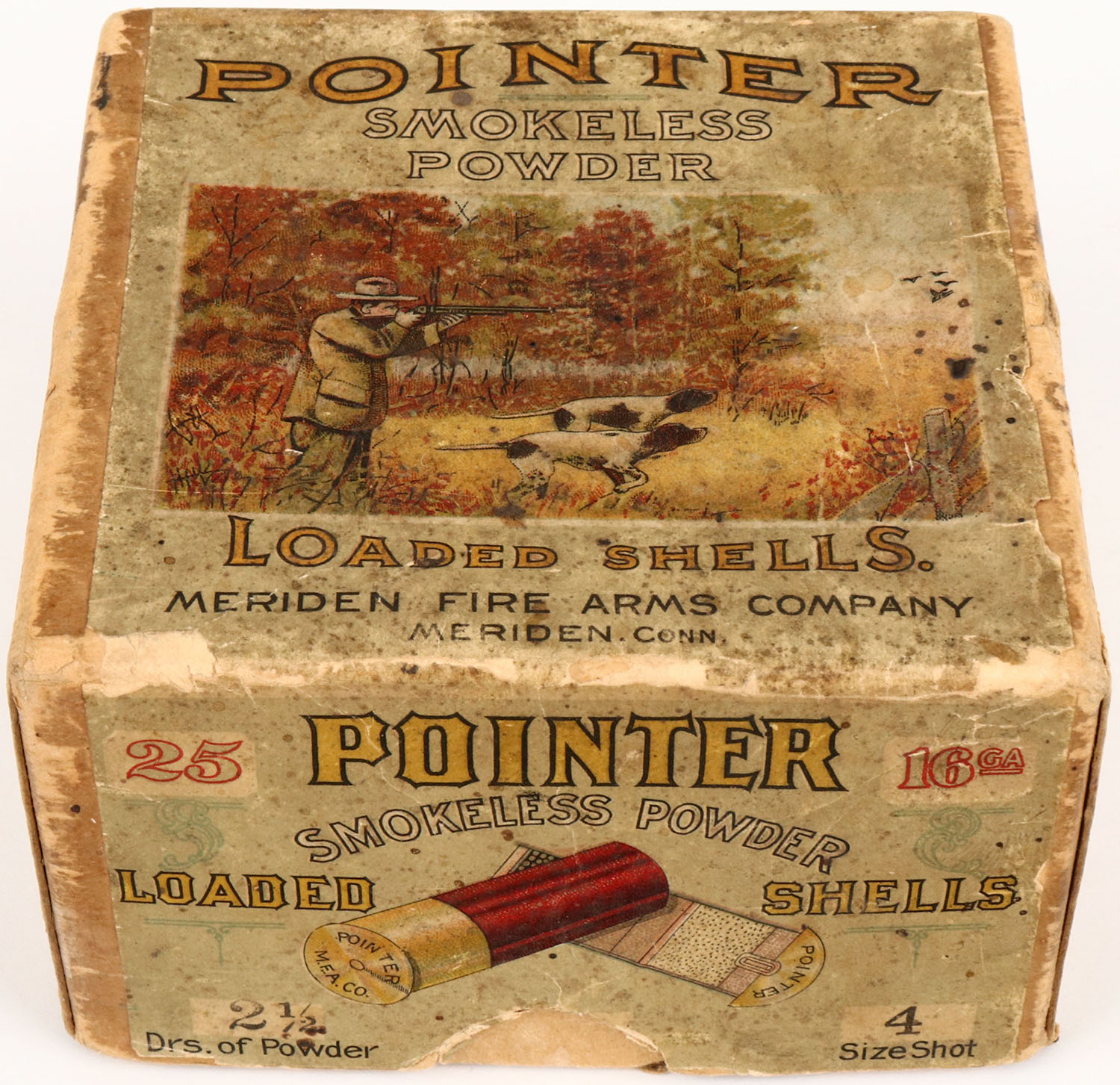 Meriden Firearms Co., POINTER, 16ga, 2pc., Empty, shot size 4 correct bottom, buff box with multi colored label pictures hunting scene on top, two crossed shells on one side & pointing dog on the other side, box has age soiling & tape repair with a seam split, label is nice. Grade: Very Good + - Value: 150 to 400