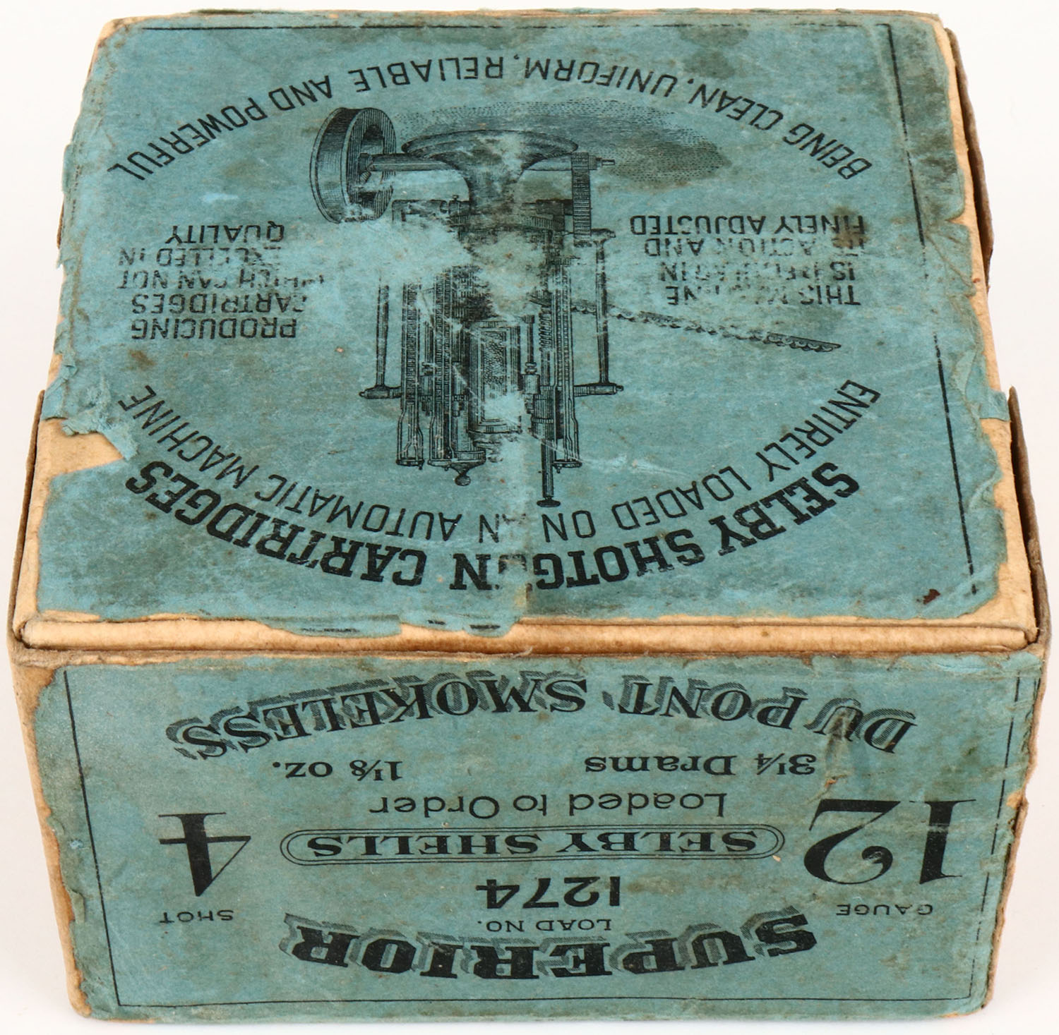 SELBY SMELTING & LEAD Co., STANDARD, 12 GAUGE, 2pc., Empty, SUPERIOR, Loaded To Order, 1 1/8 oz., No. 4, buff box with black and green label, box is very solid, with light age soiling & label is 93% intact. Grade: Excellent - Value: 70 to 300