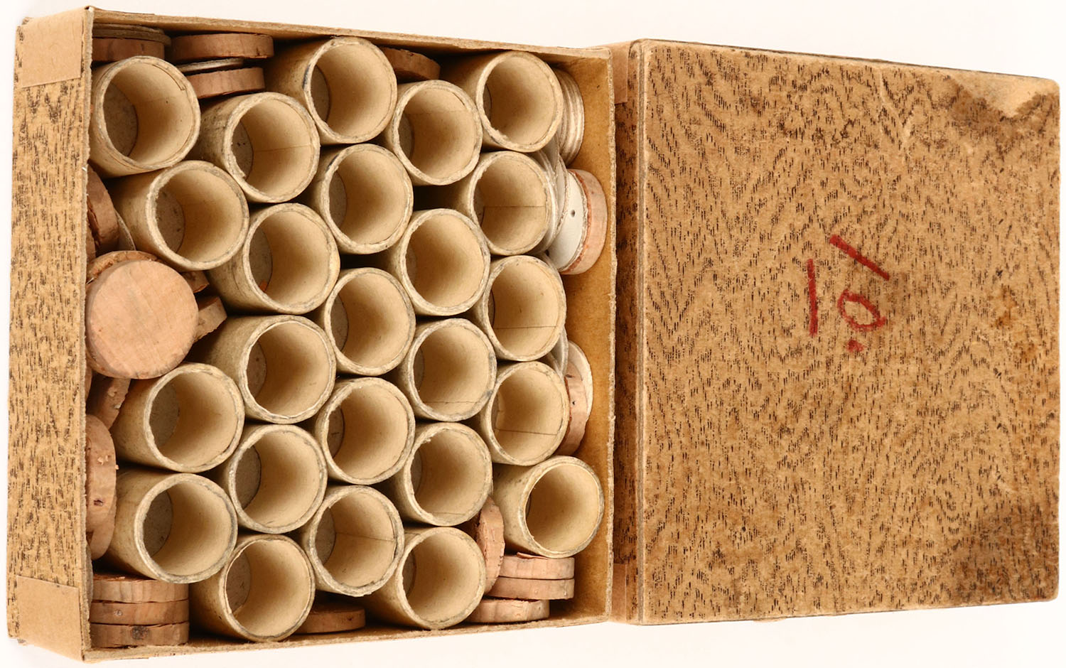 Follett Manufacture, Box contains 24 cylindrical paper containers with a brass end, Box also contains 26 cork wads for under the concentrator, there are 24 wads for use in front of the concentrator with four holes to catch the air and blow away. Grade: Excellent - Value: 10 to 50