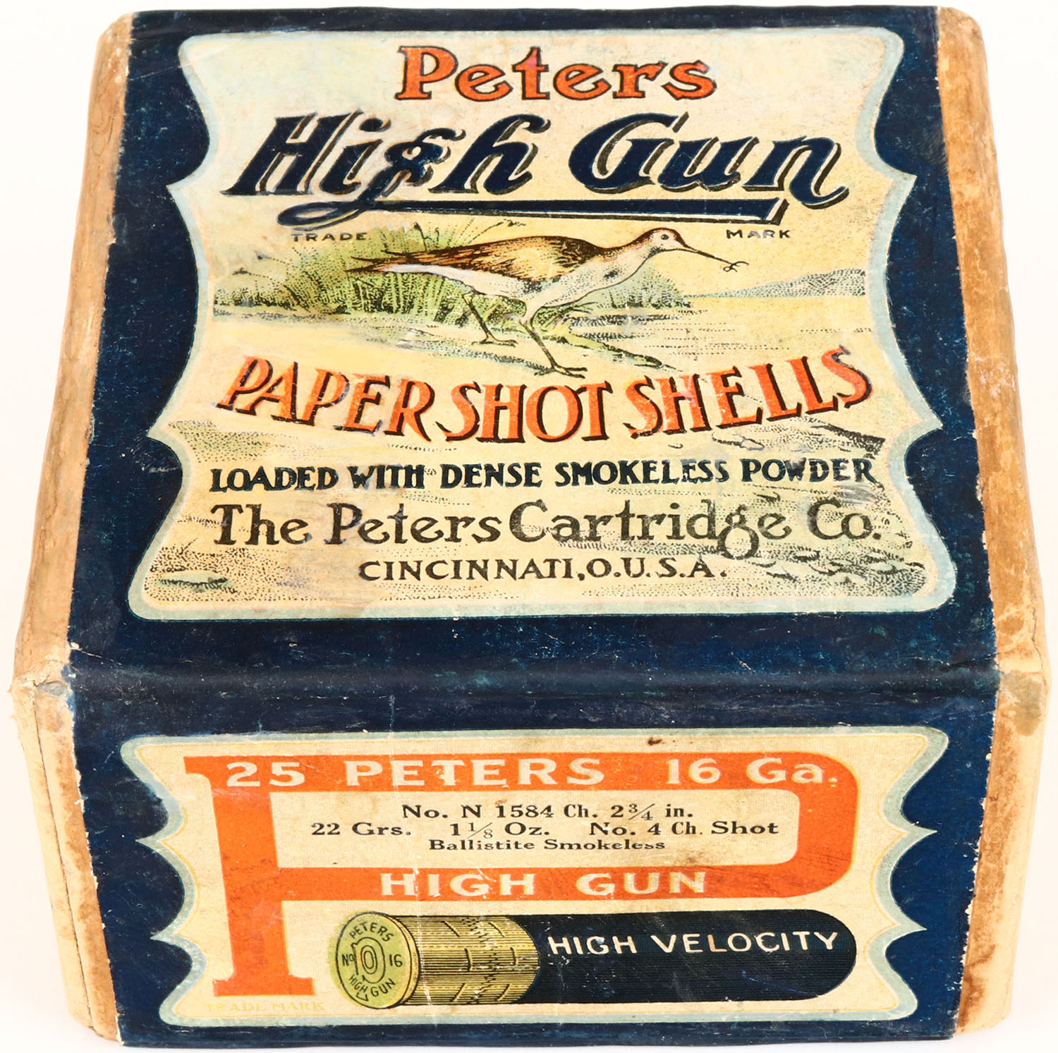 Peters Cart. Co., HIGH GUN, 16ga, 2pc., FULL & Professionally RESEALED/Restored, shot size 4CH Shot, buff box with multi colored picture of Snipe, Ballisite Smokeless, box with great color to label. * Grade: Excellent + - Value: 1000 to 5000