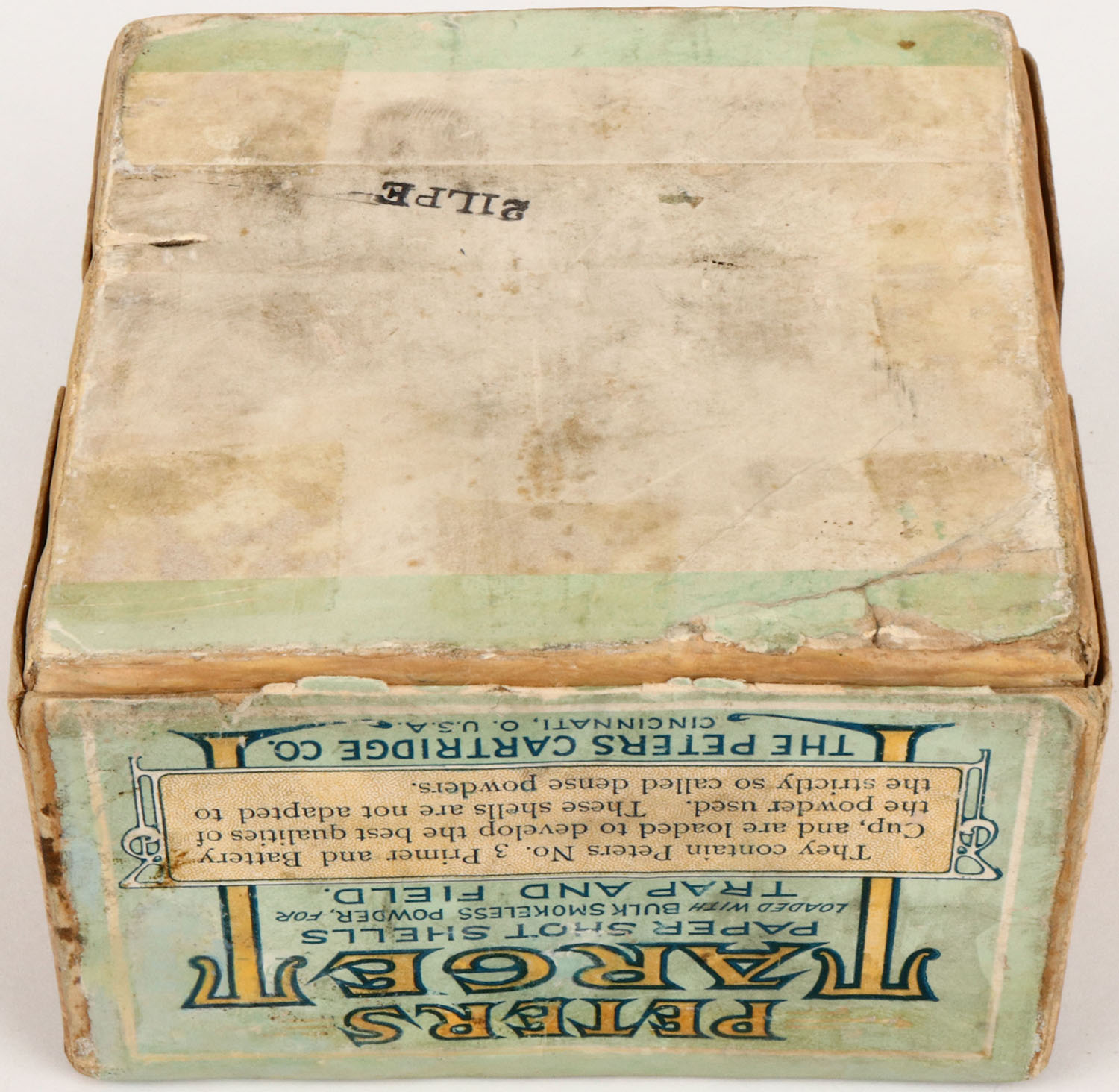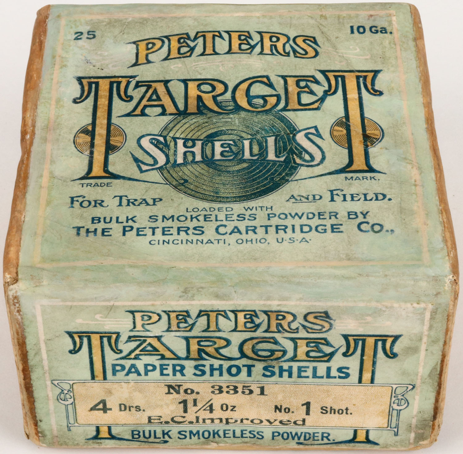 RARE!!! Peters Cart. Co. TARGET SHELLS, For Trap And Field, 10 Ga.! 2pc., Empty, shot size 1, buff box with multi colored label that pictures clay bird, box & label are solid, correct bottom, label is 100% intact and 100% original. * Grade: Excellent + - Value: 200 to 2000