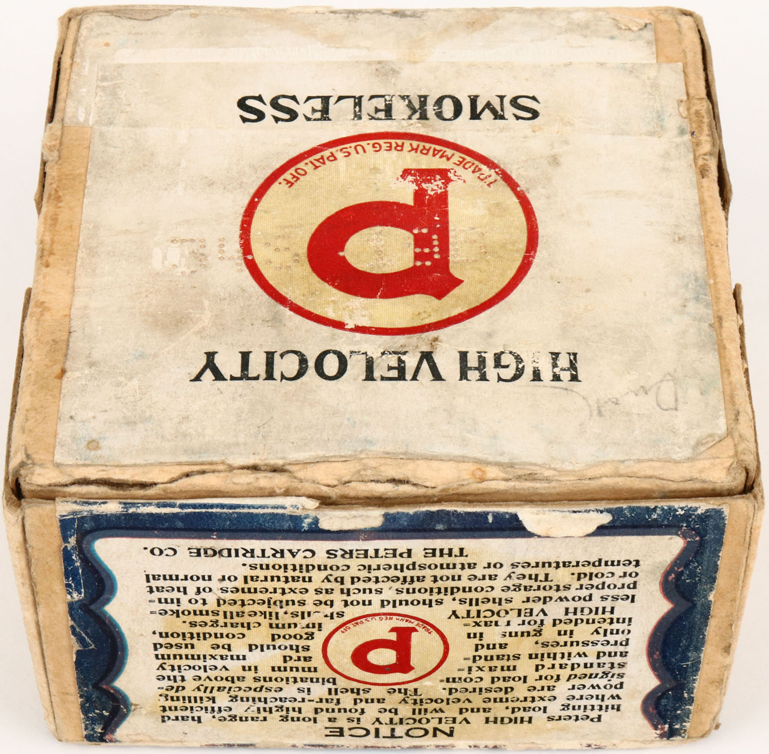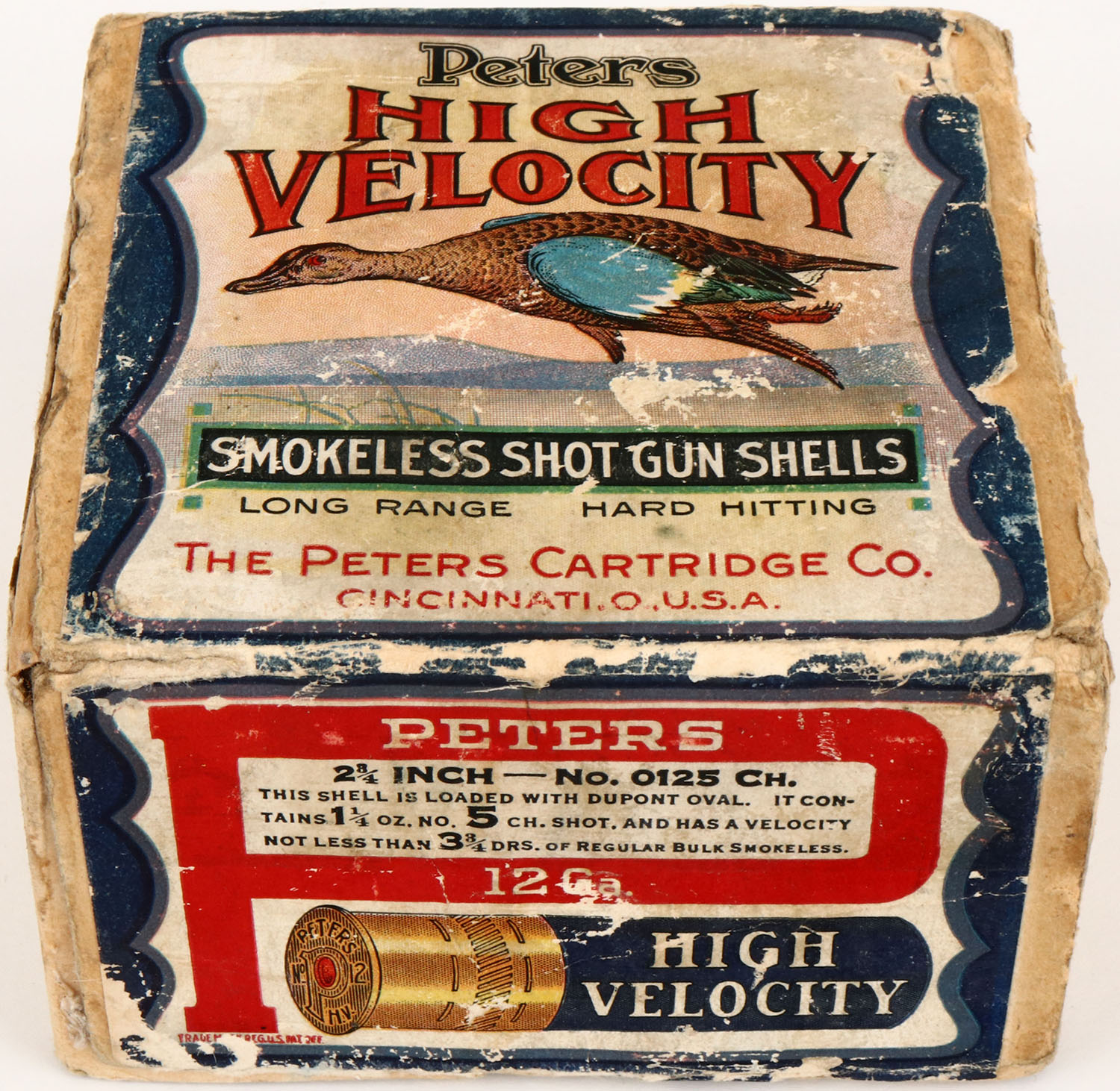 Peters Cart. Co., Blue Wing Teal, 12 Ga., 2 3/4'', 2pc., Empty, shot size 5 CH, buff box with multi colored label that pictures Blue Wing Teal in flight, box has seam splits with tape repair, scuffing, light soiling & edge wear with good label. Grade: Very Good + - Value: 100 to 500
