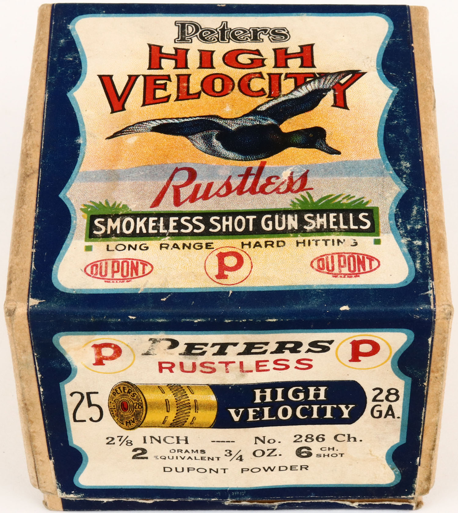 Peters Cart. Co., Blue Bill, 28ga., 2pc., Partial 10rds, shot size 6CH shot, buff box with multi colored label that pictures Blue Bill in flight, box is solid with great label, shells are very good. Grade: Excellent - Value: 100 to 400