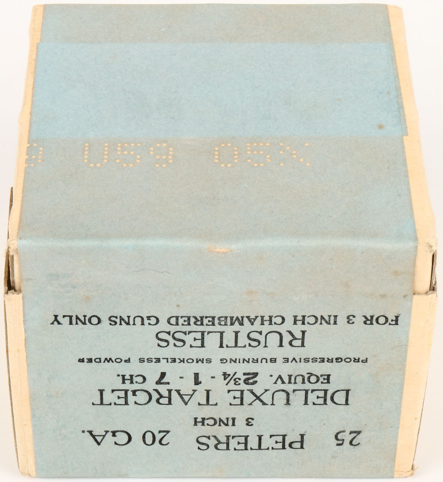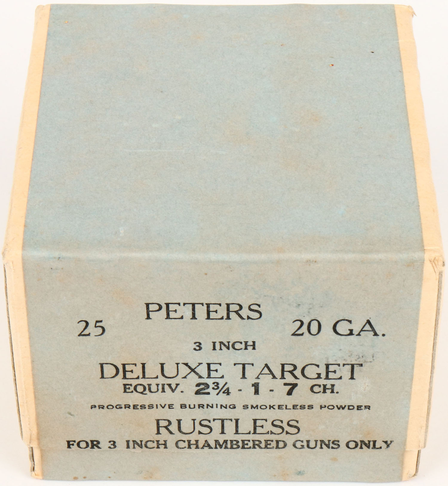 Peters, DELUXE TARGET, 20ga., 2pc., FULL & SEALED, shot size 7CH., buff box with blue & black label, 3 Inch, box is NEAR STONE COLD MINT, we do not see this one very often. Grade: MINT - Value: 80 to 300