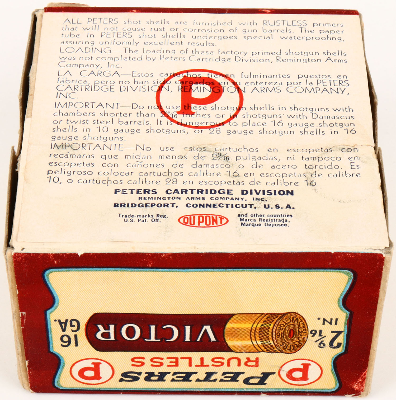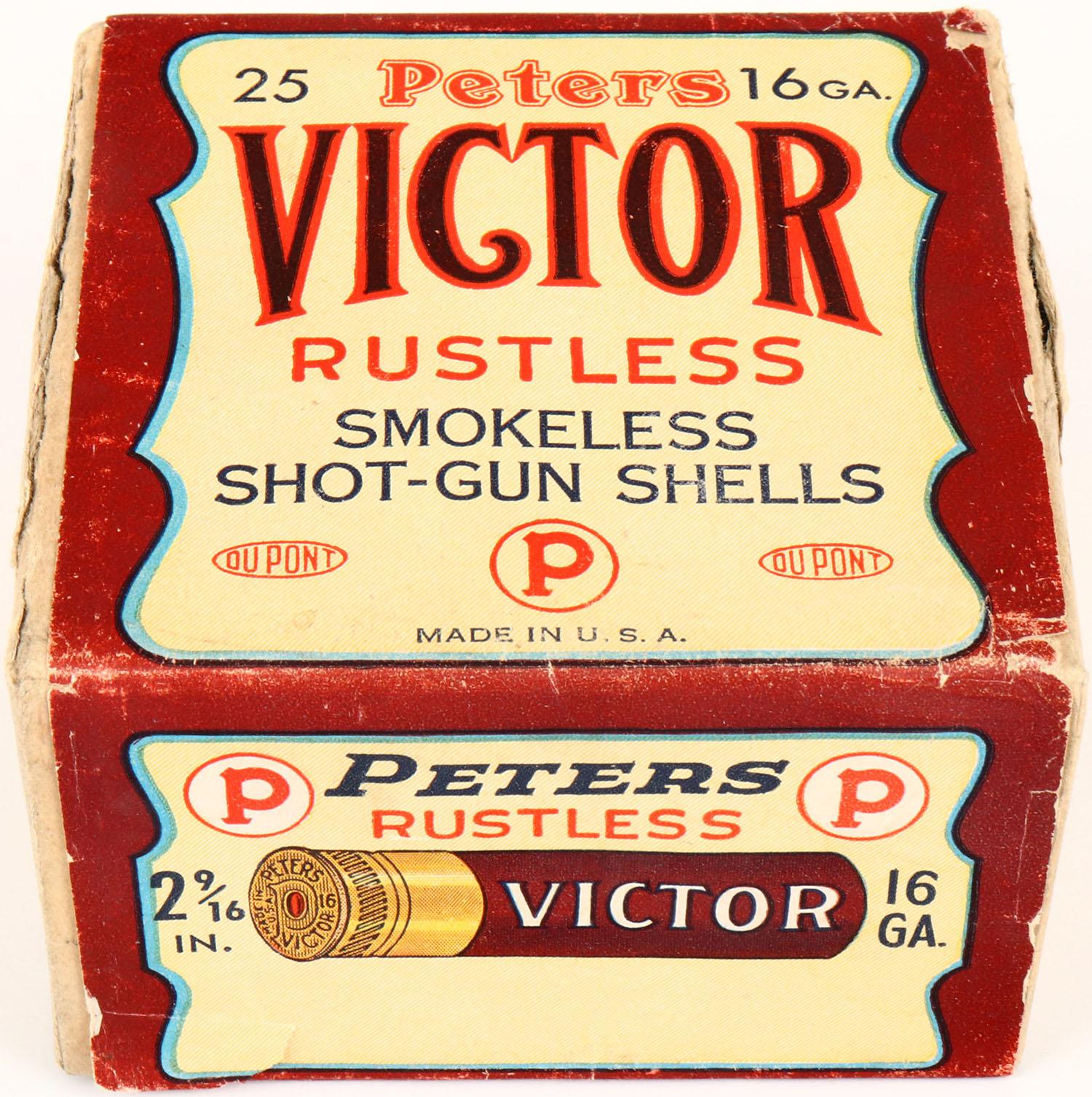 Peters Cart. Co., Victor, Rustless, 16ga., 2pc., FULL & SEALED, shot size 6CH, buff box with brown, cream & black label, box is solid with a great label. Grade: Very Good ++ - Value: 30 to 70