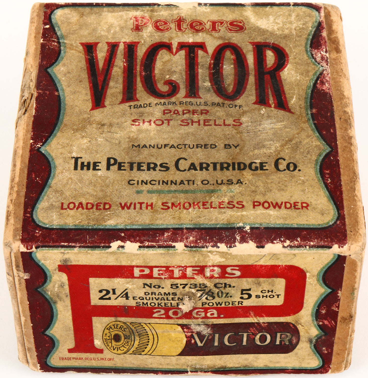 Peters Cart. Co., Victor, 20ga., 2pc., Empty, shot size 5CH, buff box with brown, cream & black label, box has age soiling & scuffing. Grade: Very Good + - Value: 20 to 60