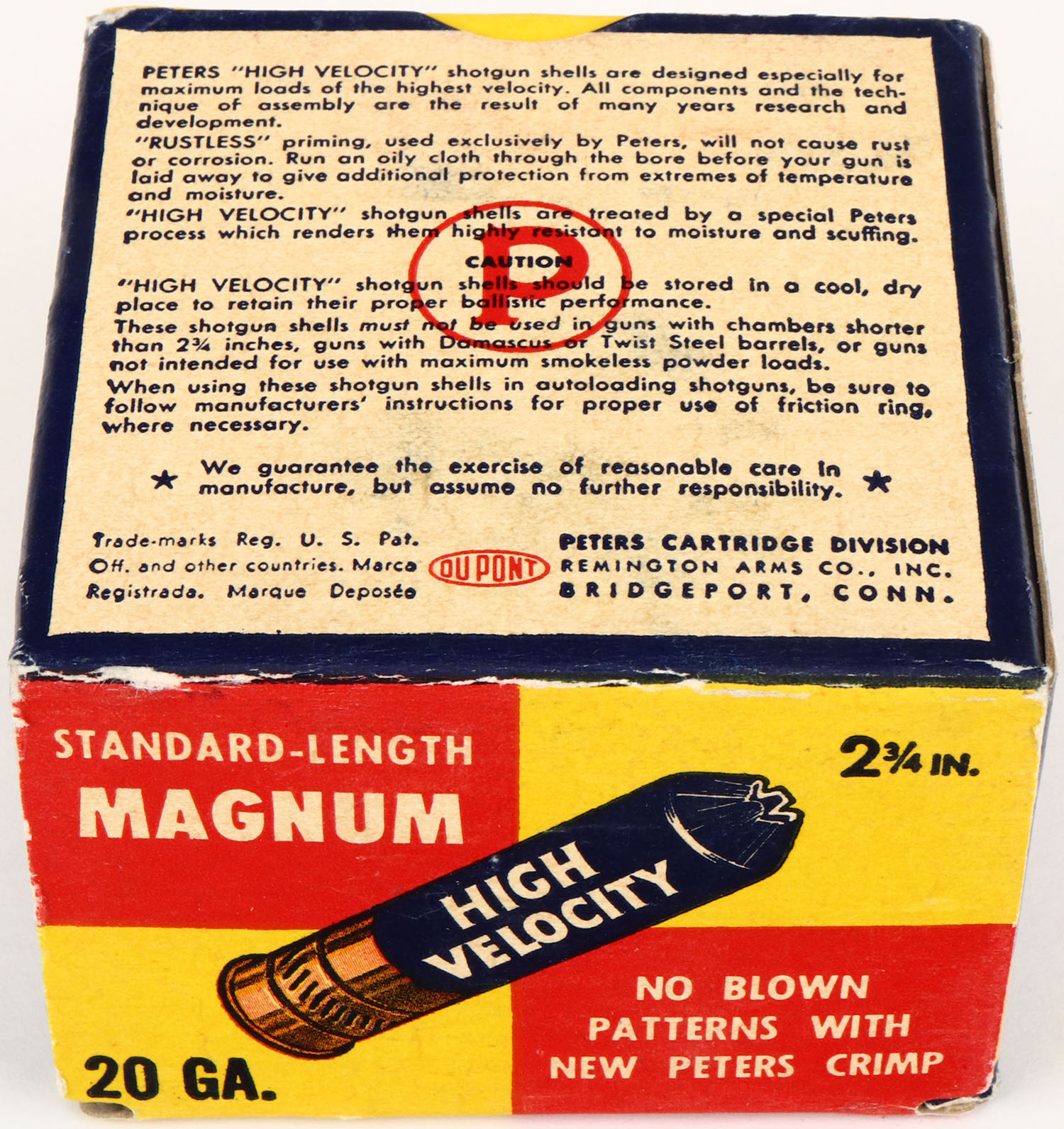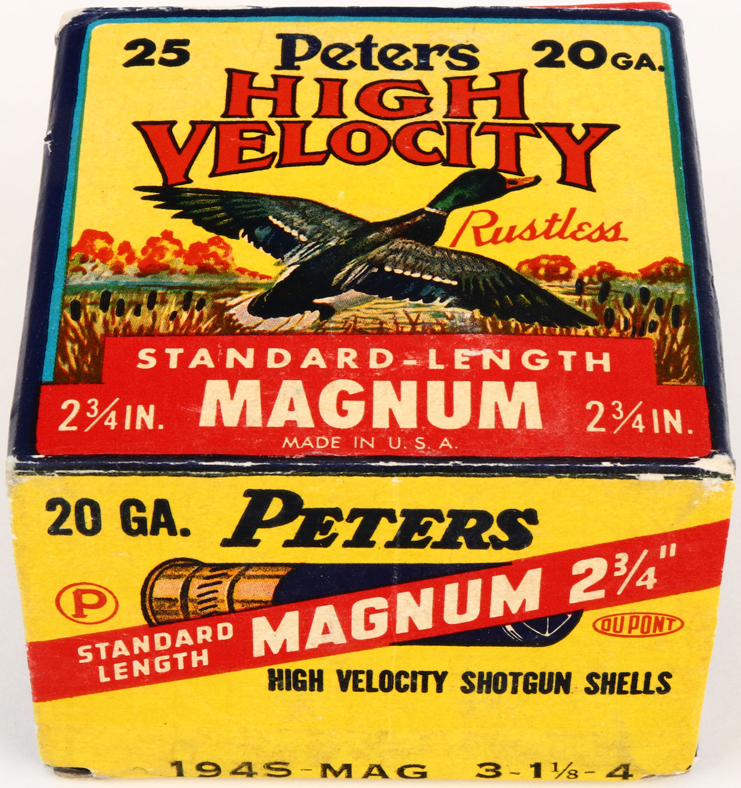 Peters, High Velocity - Rustless, 20ga. MAGNUM, 1pc., Full, shot size 4, multi-colored box with mallard duck flying out of marsh grass, box is solid, with great colors, shells are excellent. Grade: Excellent + - Value: 50 to 200
