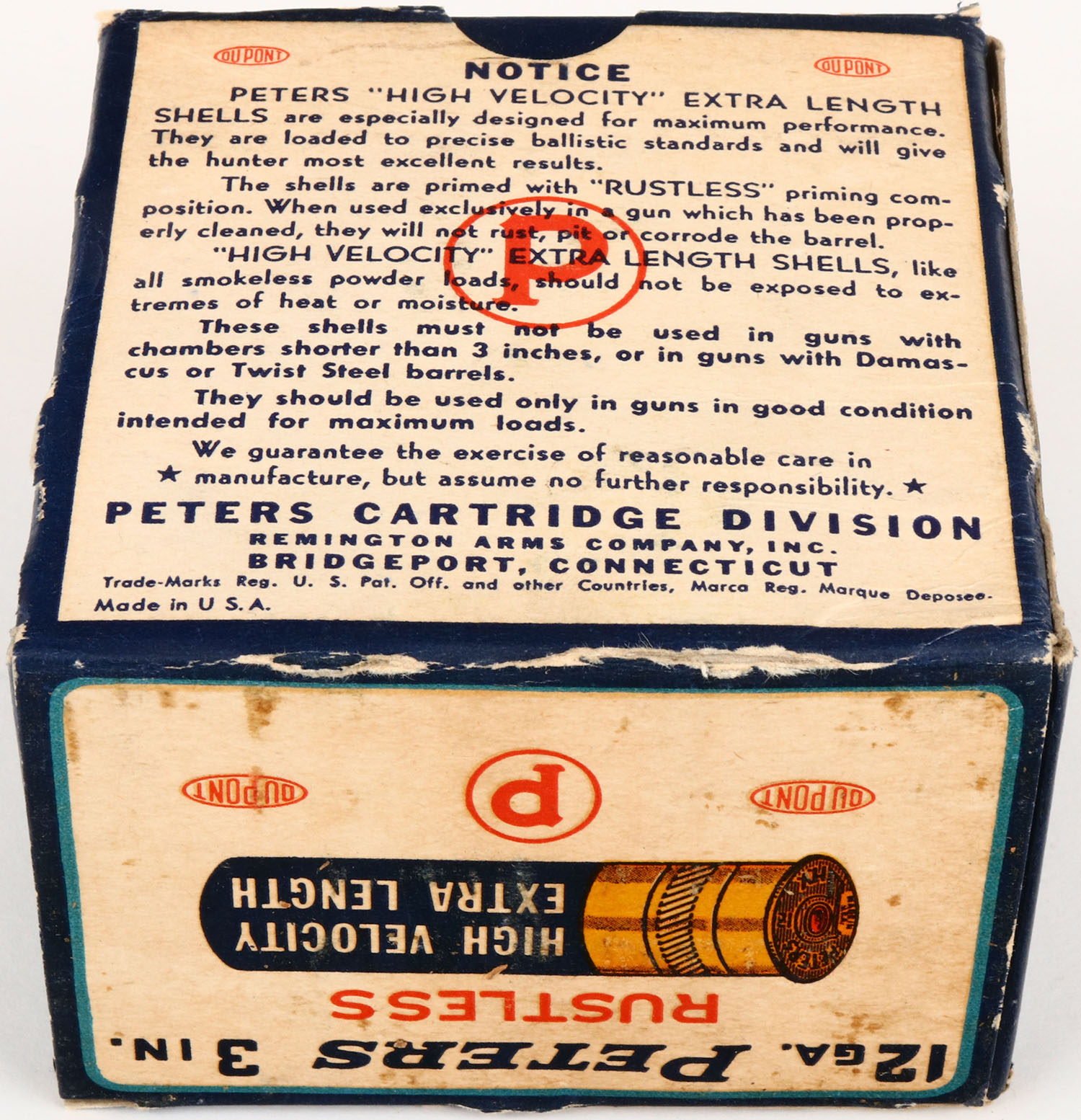 Peters Cart. Co., Bridgeport, CT, High Velocity, Extra Length 12ga. 3 in, Magnum, 1pc., Full, shot size 4, multi colored box that pictures mallard flying out of the marsh grass, has almost torn off top flap, edge wear with nice colors, shells are excellent. Grade: Excellent - Value: 50 to 200