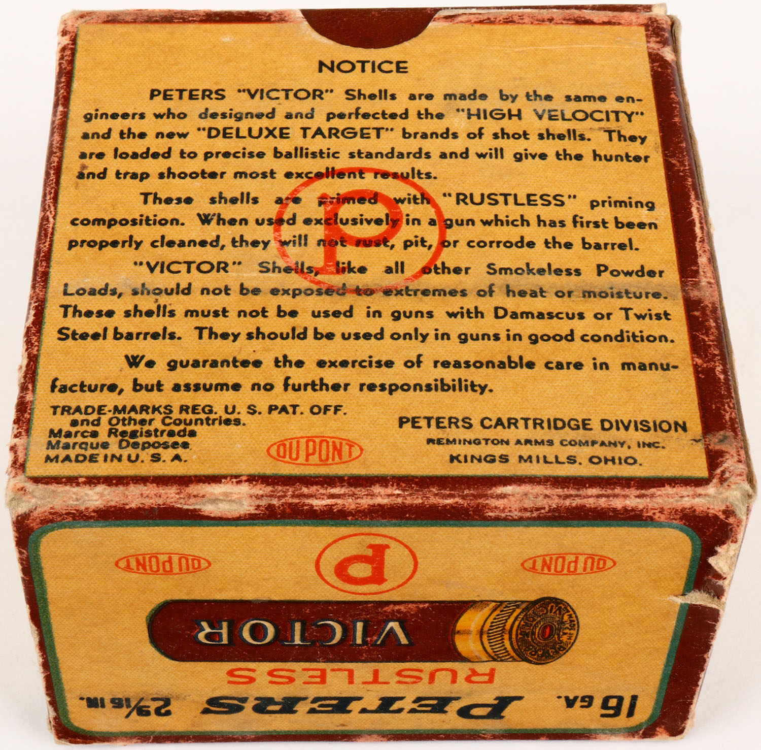 Peters, Victor, 16ga, 1pc., Full with 6 being incorrect shot size, shot size 4 CH, Maroon, cream & orange box, 2 9/16'', box has light edge wear and very nice colors. Shells are excellent. Grade: Very Good ++ - Value: 20 to 50