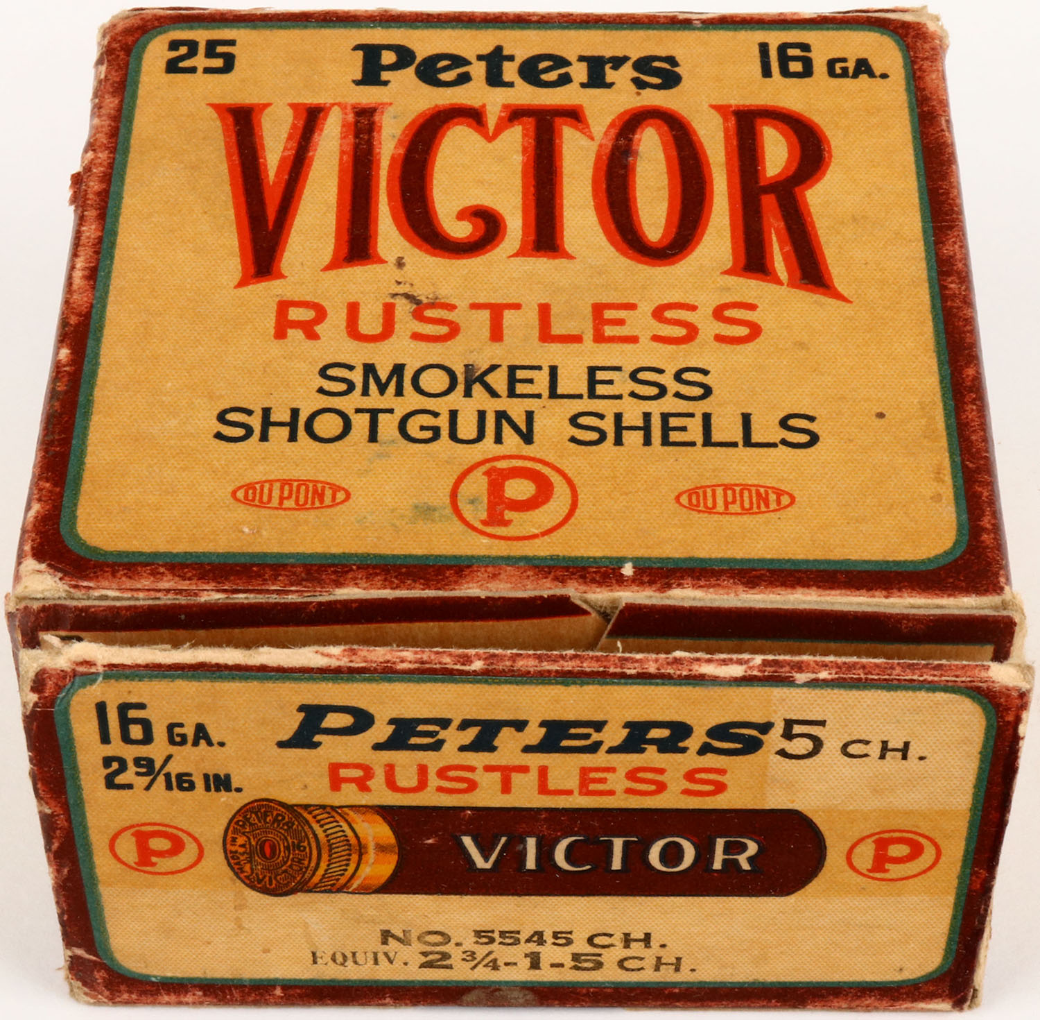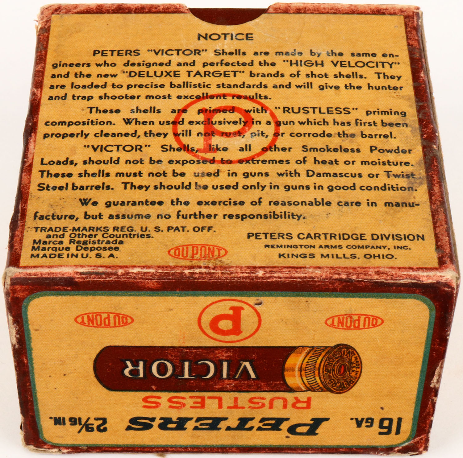 Peters, Victor, 16ga, 1pc., Full, shot size 5 CH, Maroon, cream & orange box, 2 9/16'', box is solid with inside flap & top flap disconnected, has very nice colors. Shells are excellent. Grade: Excellent - Value: 20 to 50
