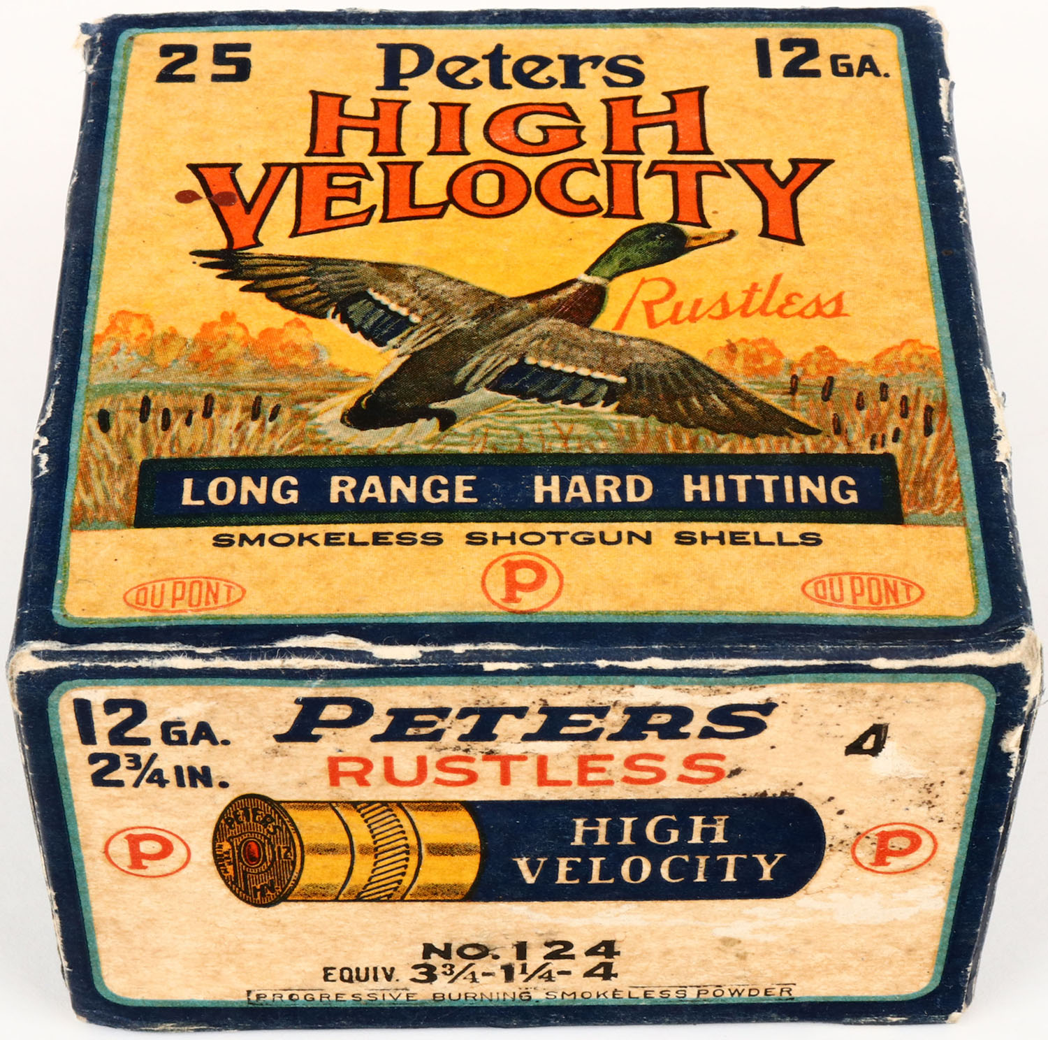Peters Cart. Co., Bridgeport, CT, High Velocity, 12ga., 1pc., Full, shot size 4, multi colored box that pictures mallard flying out of the marsh grass, box is solid with light edge wear, and age soiling nice color, shells are excellent. Grade: Excellent - Value: 20 to 80