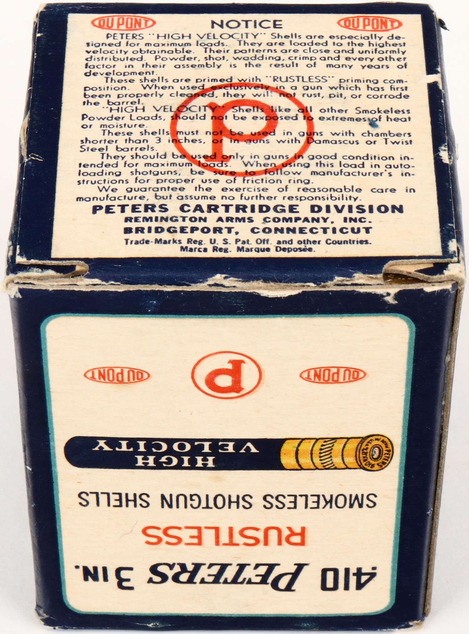 Peters, High Velocity, 410ga., 3 in., 1pc., Full, shot size 7 1/2CH, multi-colored box with mallard duck flying out of marsh grass, box is solid with great colors, Rare with duck on top flap, shells are excellent. Grade: Excellent + - Value: 20 to 100