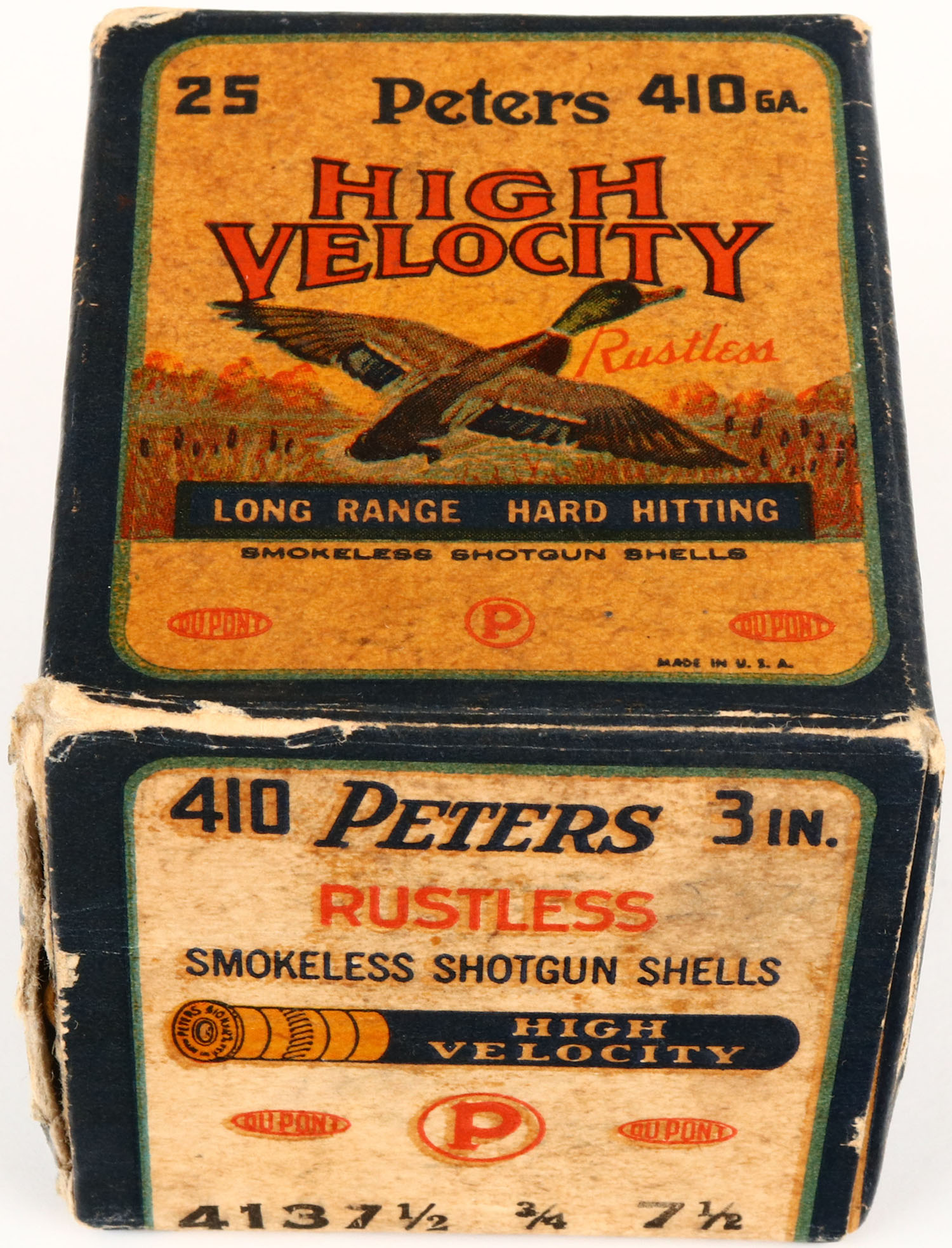 Peters, High Velocity, 410ga., 3 in., 1pc., Full, shot size 7 1/2, multi-colored box with mallard duck flying out of marsh grass, box has age soiling, edge wear with inside flap torn off, shells are excellent. Grade: Very Good + - Value: 20 to 80