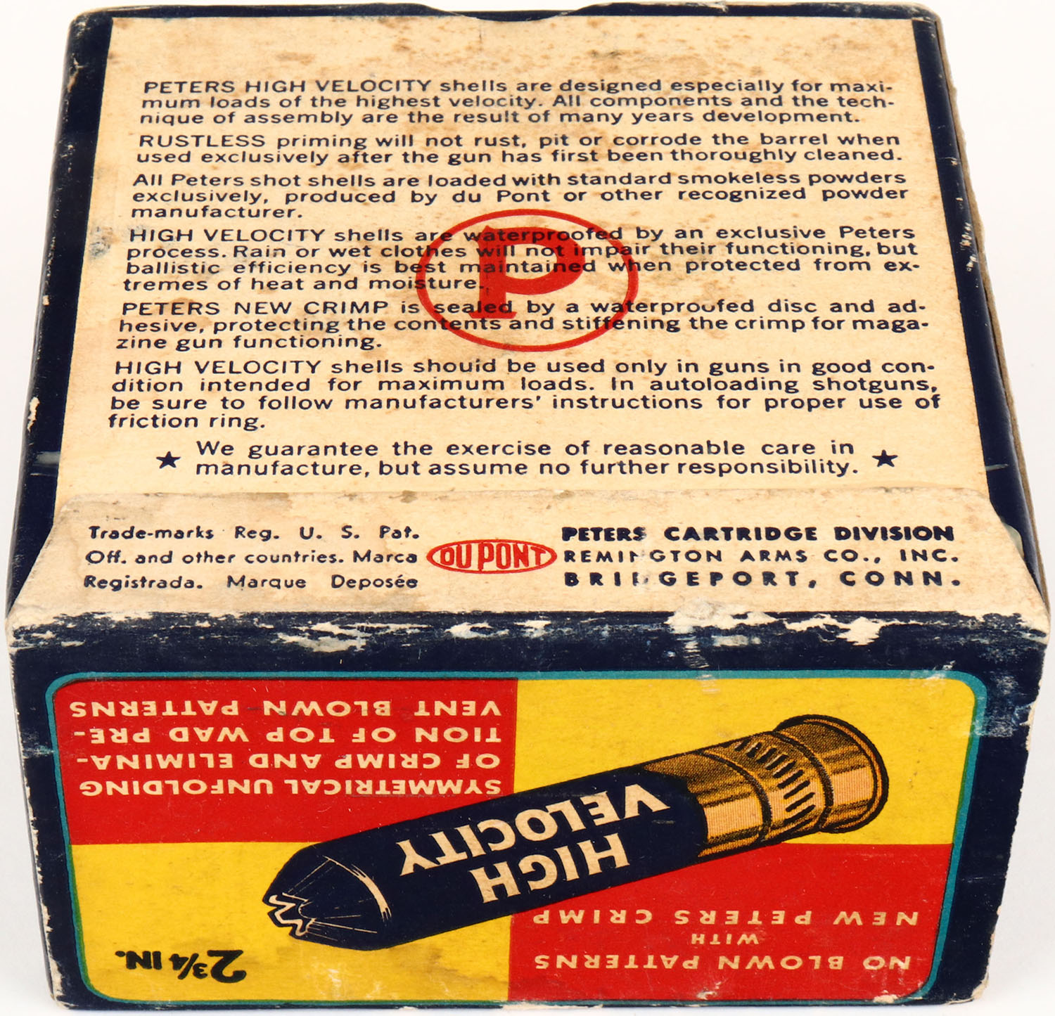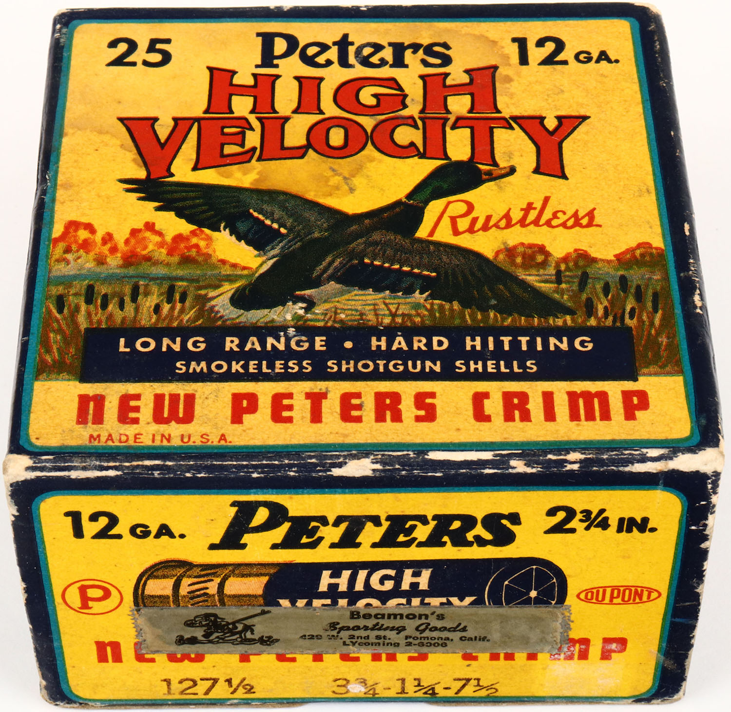 Peters Cart. Co., High Velocity, New Peters Crimp, 12ga., 1pc., Full, shot size 7 1/2, multi colored box that pictures mallard flying out of the marsh grass, paper shells, box is very solid with nice colors, light edge wear & light age soiling, shells are very good. Grade: Very Good ++ - Value: 10 to 40