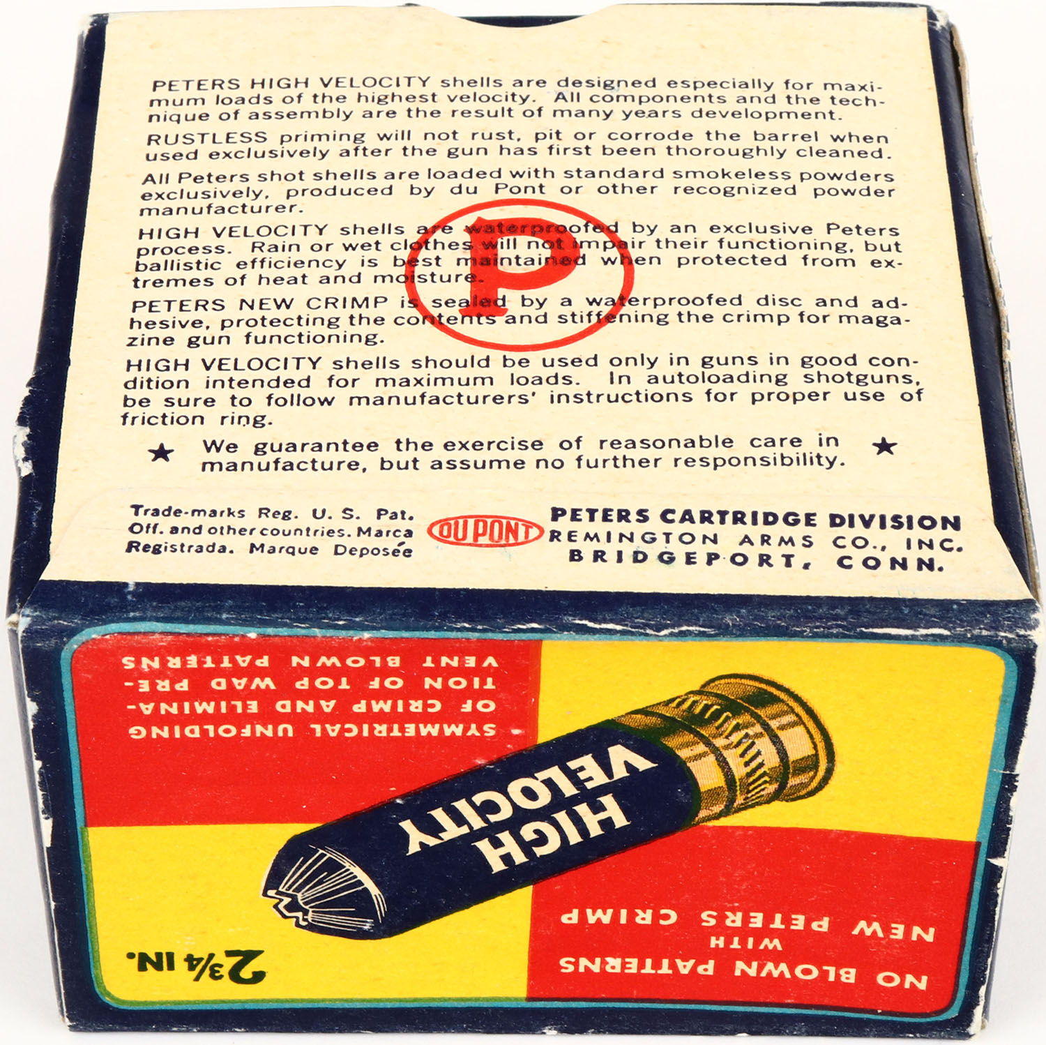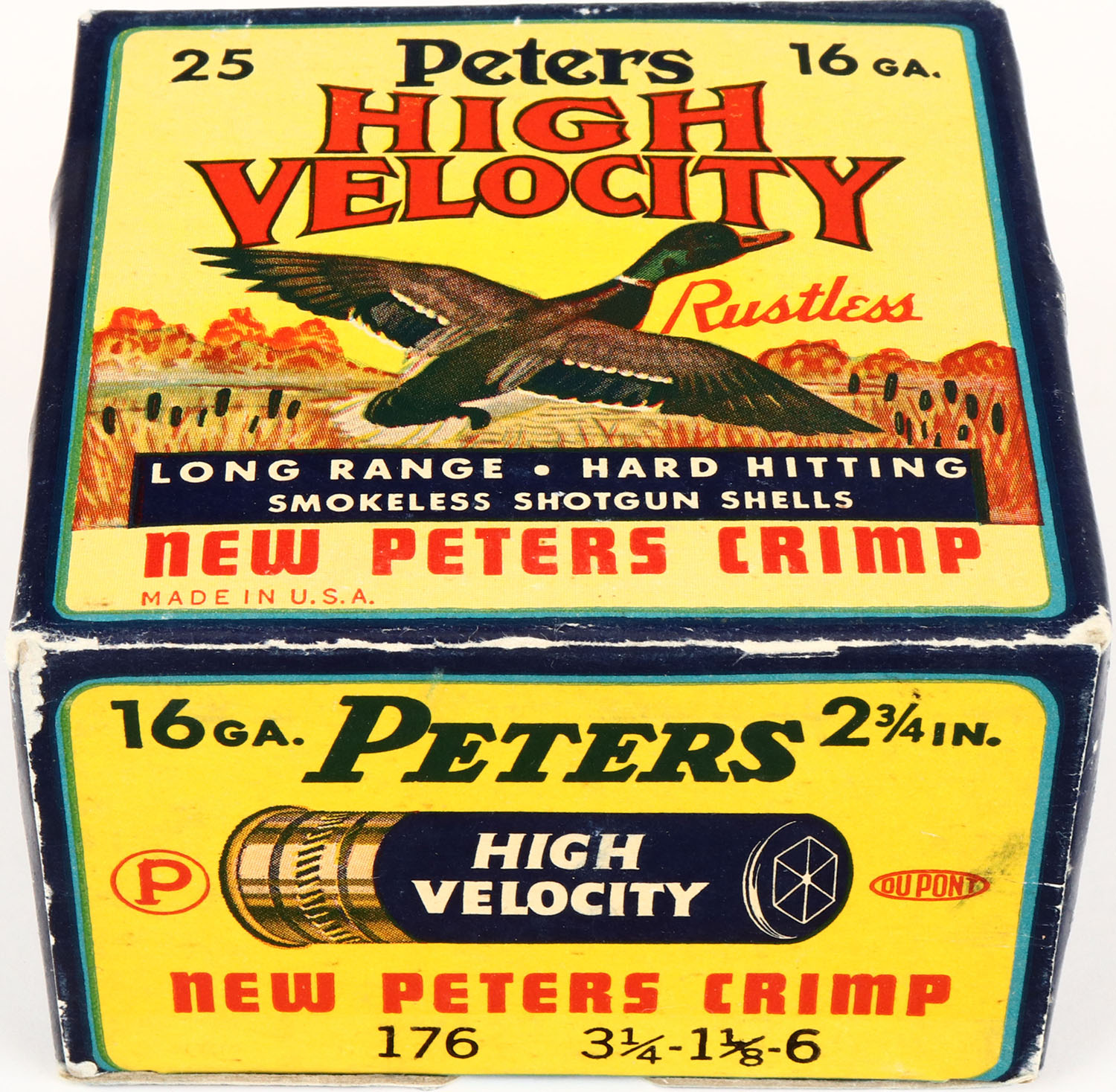 Peters Cart. Co., High Velocity, New Peters Crimp, 16ga., 1pc., Full, shot size 5, multi colored box that pictures mallard flying out of the marsh grass, paper shells, box has light shell protrusions with very nice colors, shells are excellent. Grade: Excellent + - Value: 20 to 50