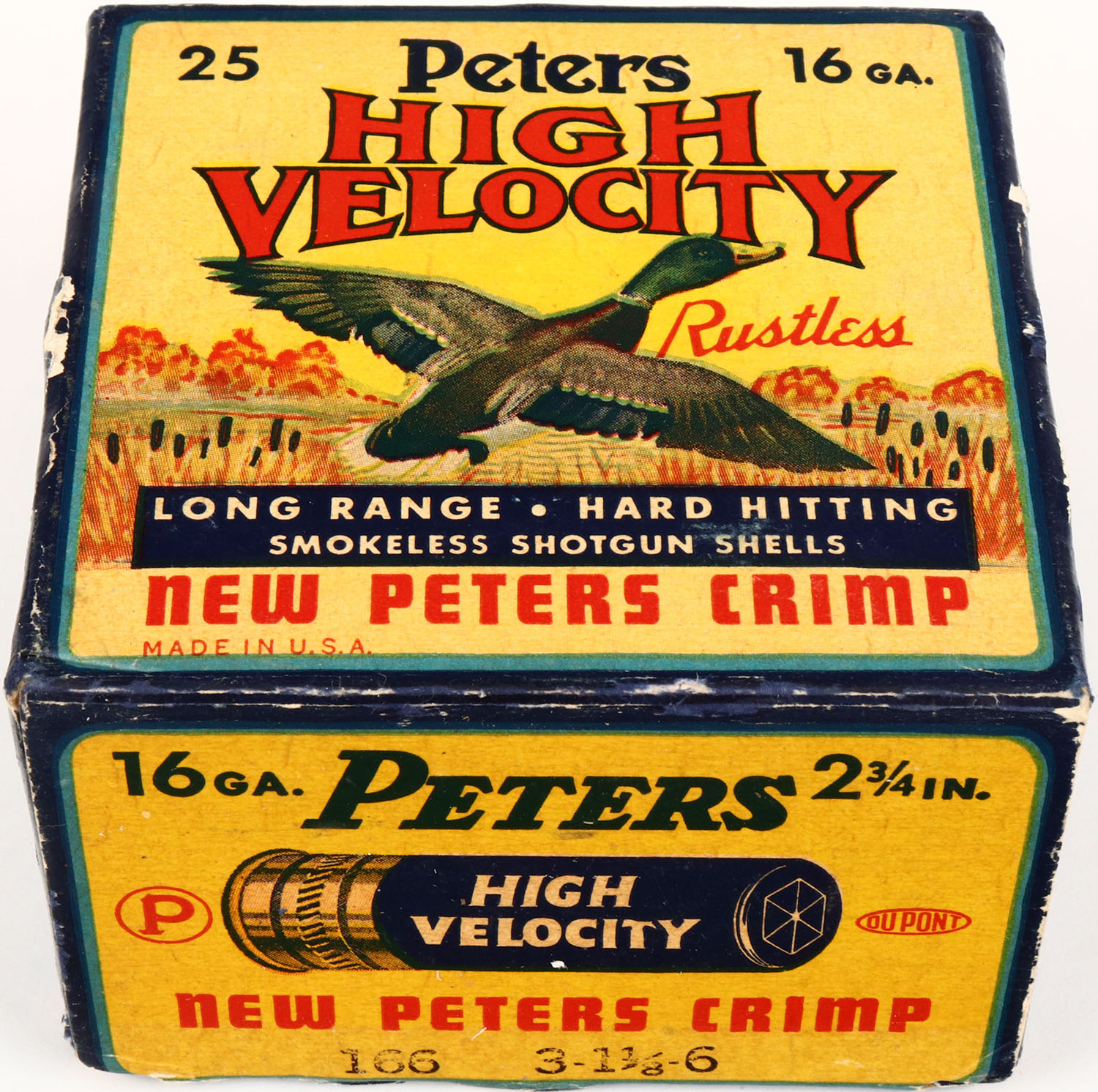 Peters Cart. Co., High Velocity, New Peters Crimp, 16ga., 1pc., Full, shot size 6, multi colored box that pictures mallard flying out of the marsh grass, paper shells, box has edge wear with shell protrusions and nice colors, shells are very good. Grade: Excellent + - Value: 20 to 50