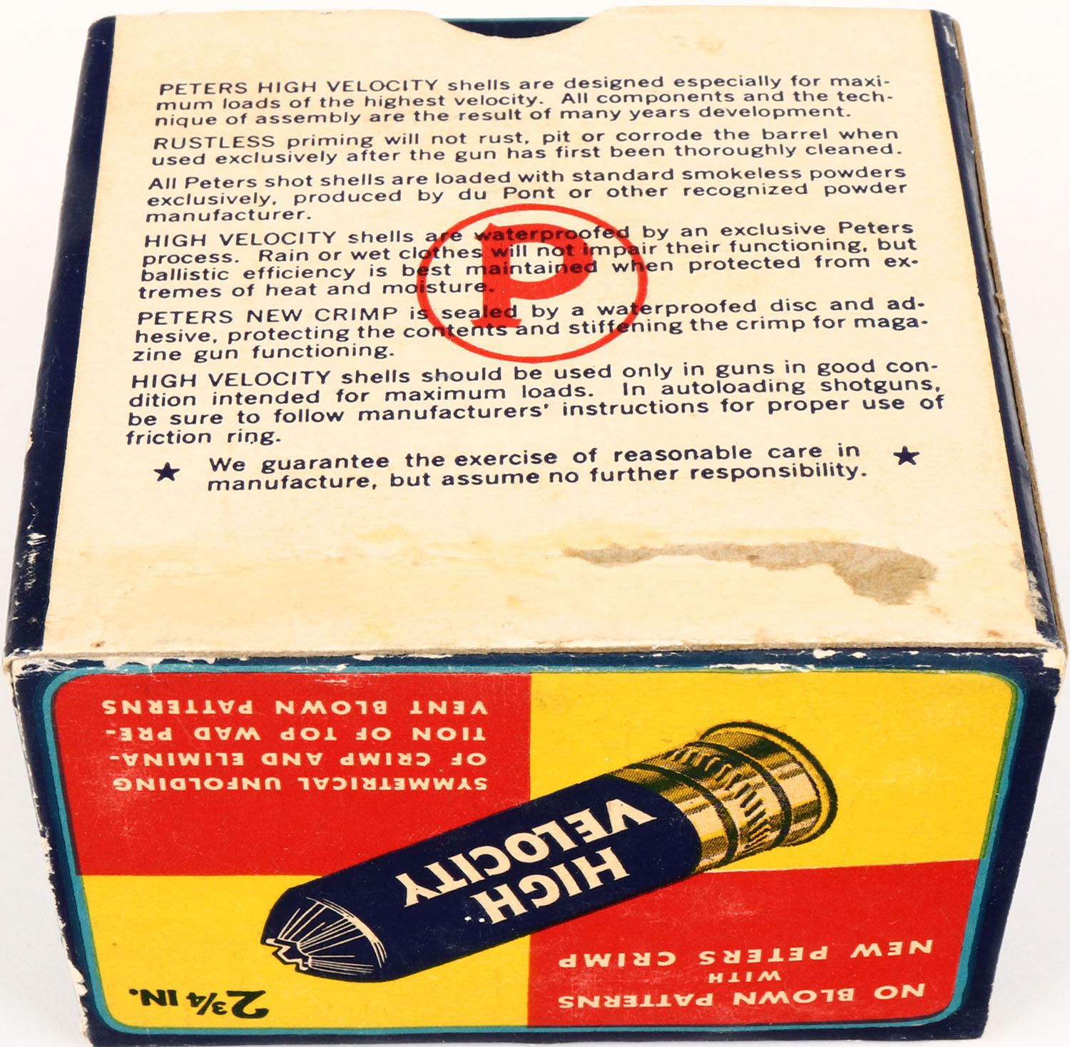 Peters Cart. Co., High Velocity, New Peters Crimp, 16ga., 1pc., Empty, shot size 6, multi colored box that pictures mallard flying out of the marsh grass, box is very solid with great colors. Grade: Excellent ++ - Value: 6 to 30