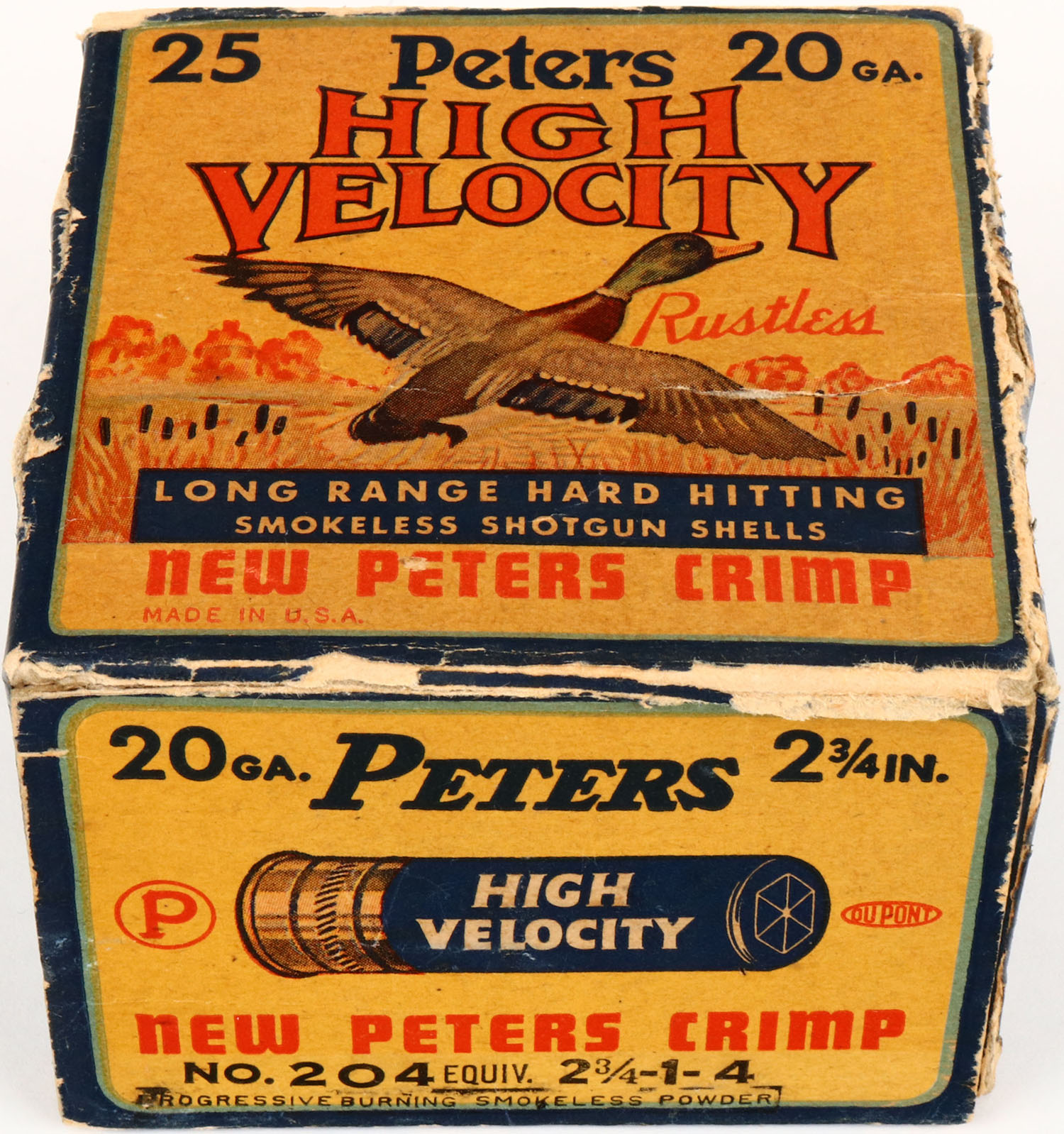 Peters Cart. Co., High Velocity, New Peters Crimp, 20ga., 1pc., Full, shot size 4, multi colored box that pictures mallard flying out of the marsh grass, paper shells, box has shell protrusions, edge wear, & has a seam split with nice colors, Shells are very good. Grade: Very Good ++ - Value: 20 to 50