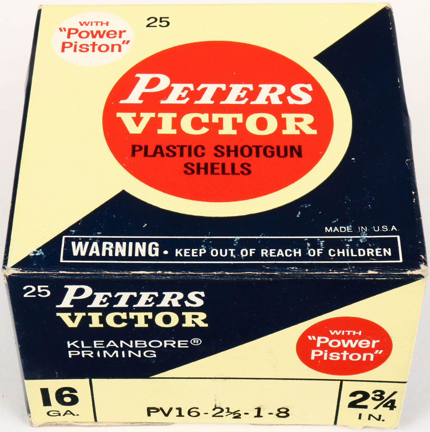 Peters, VICTOR, 16ga., 1pc., Full, shot size 8, red, blue & tan box, box is very solid with very nice colors, shells are excellent. Grade: Excellent + - Value: 10 to 40