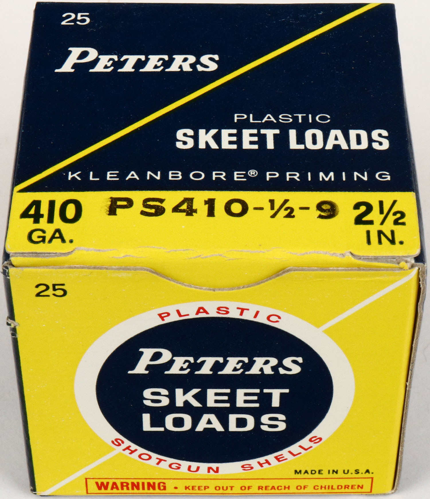 Peters Cart. Div., 410ga, 2 1/2'', 1pc., Full, shot size 9, multi colored box, box is very solid, shells are excellent. Grade: Excellent ++ - Value: 10 to 40