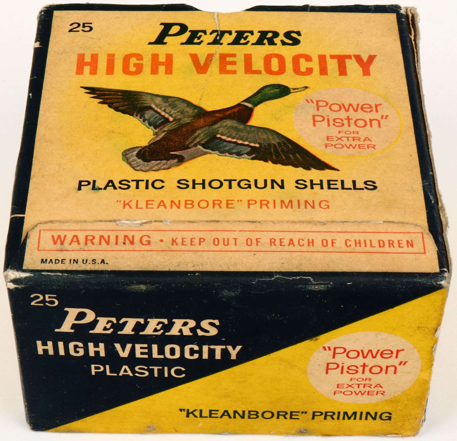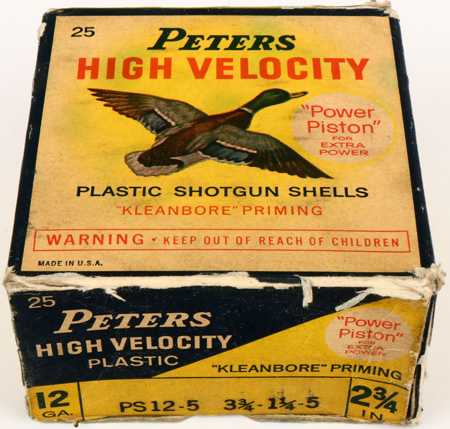 Peters, High Velocity, 12ga, 2 3/4'', 1pc., Partial 7rds, shot size 5, multi colored box that pictures mallard flying, box is solid with nice color, shells are excellent. Grade: Excellent + - Value: 8 to 30