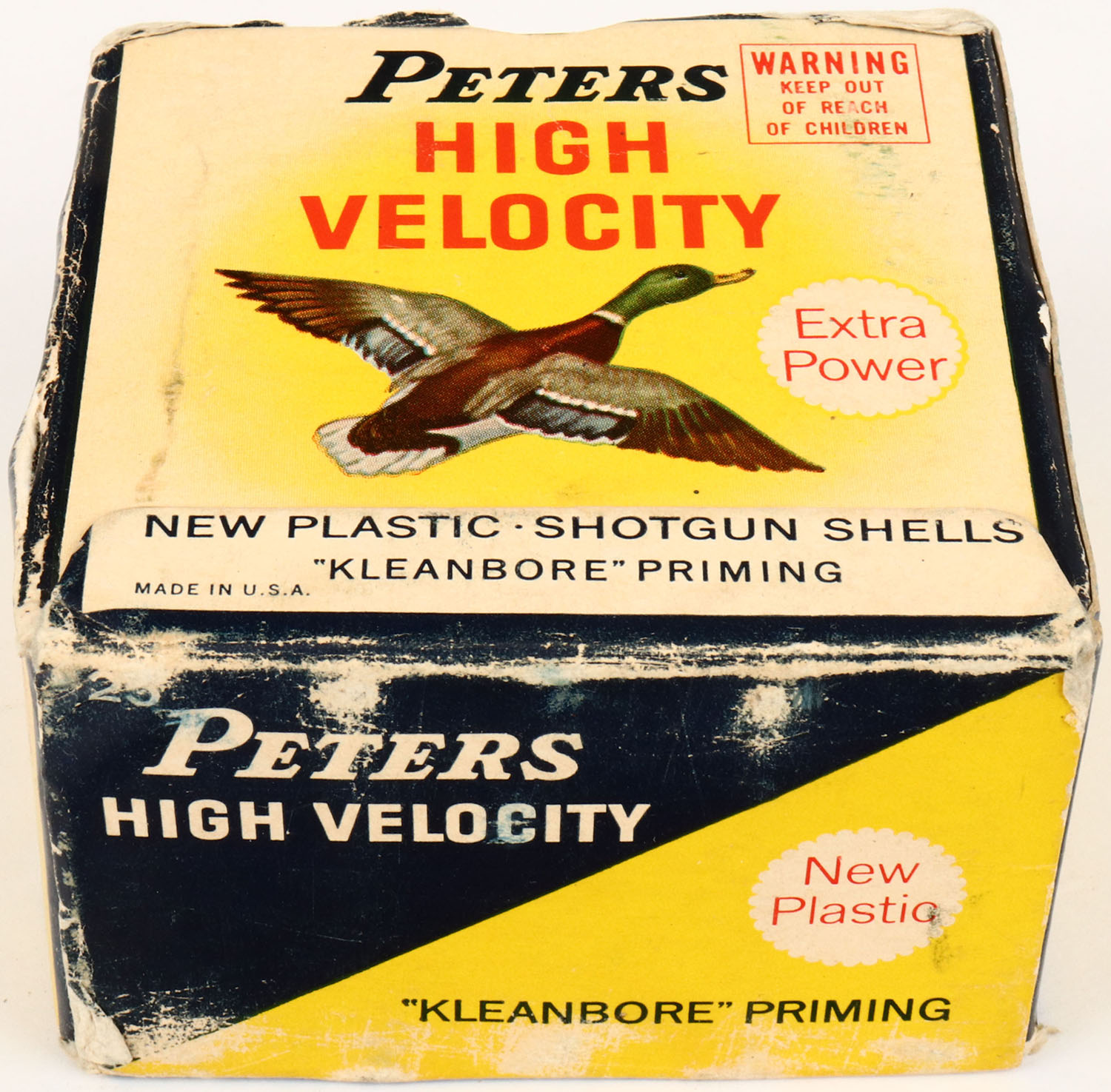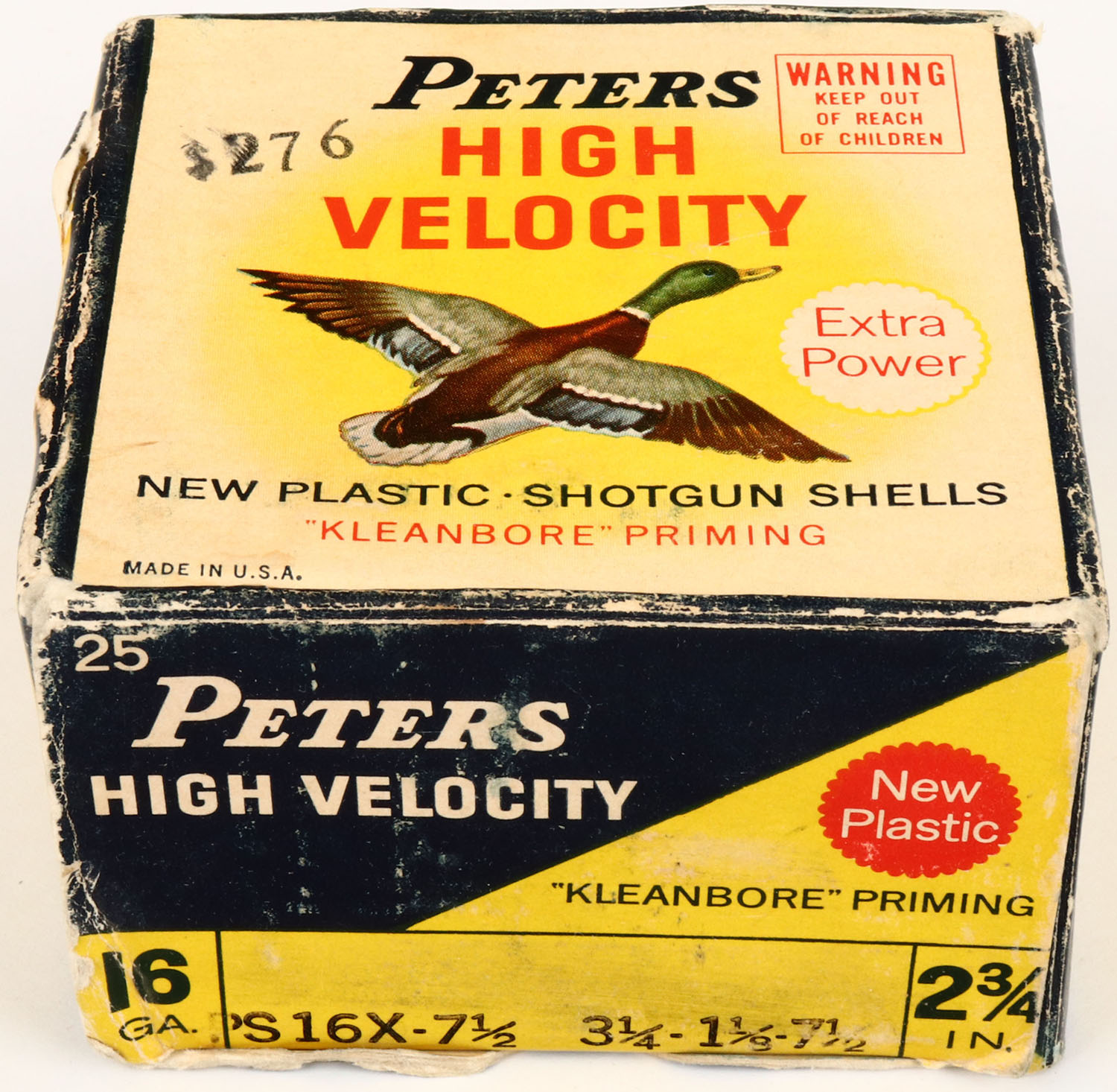 Peters, High Velocity, 16ga, 2 3/4'', 1pc., Full, shot size 7 1/2, multi colored box that pictures mallard flying, box is solid with edge wear, shell protrusions, very good color, shells are very good. Grade: Very Good ++ - Value: 10 to 30