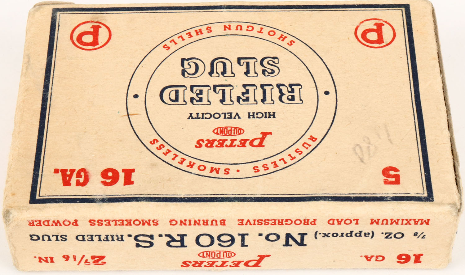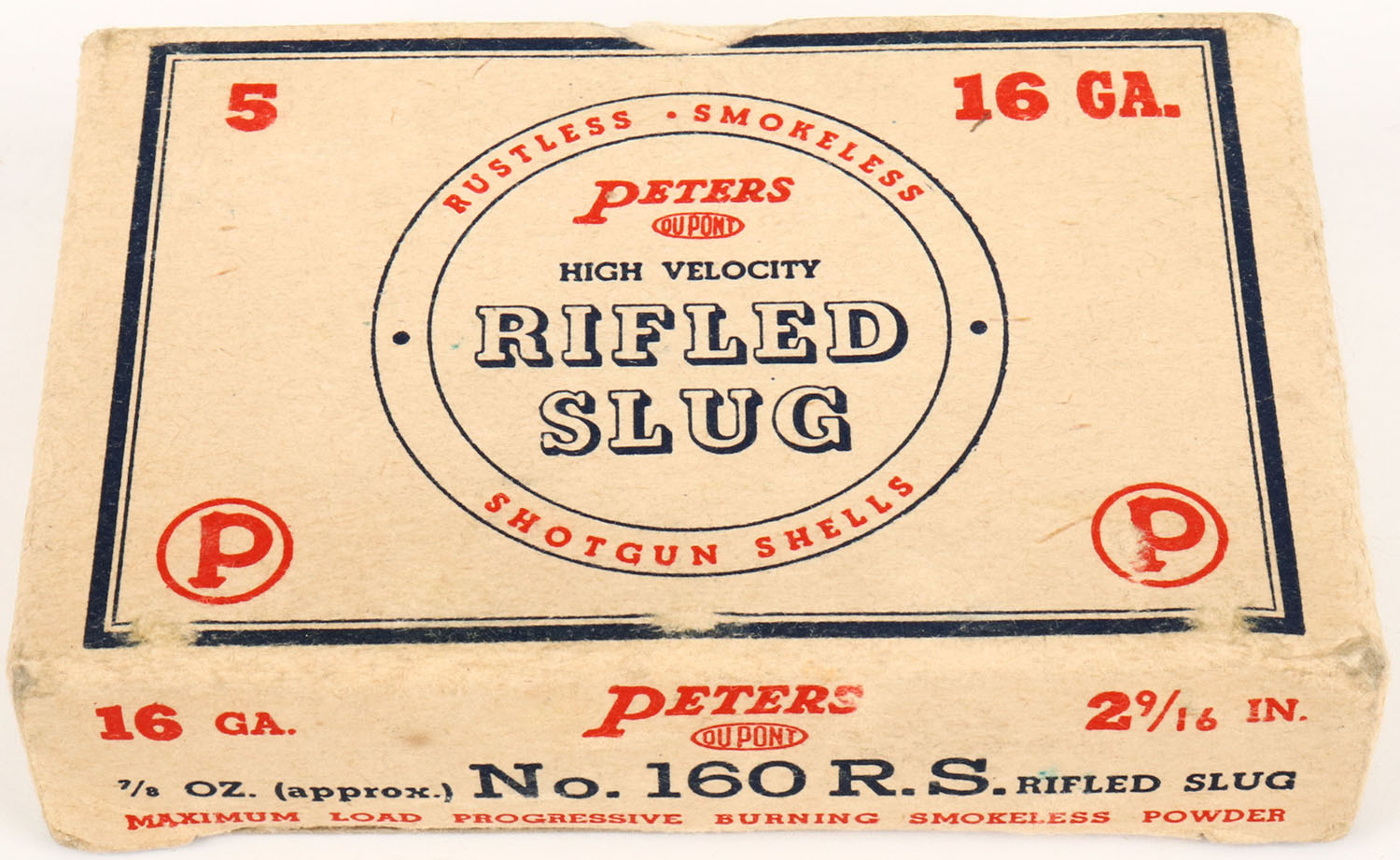 Peters Cart. Co., RIFLED SLUGS, 16 GAUGE, 2 9/16'', 1pc., Full, shot size Rifled Slug, multi colored box, box is very solid, shells are excellent. Grade: Excellent + - Value: 4 to 20