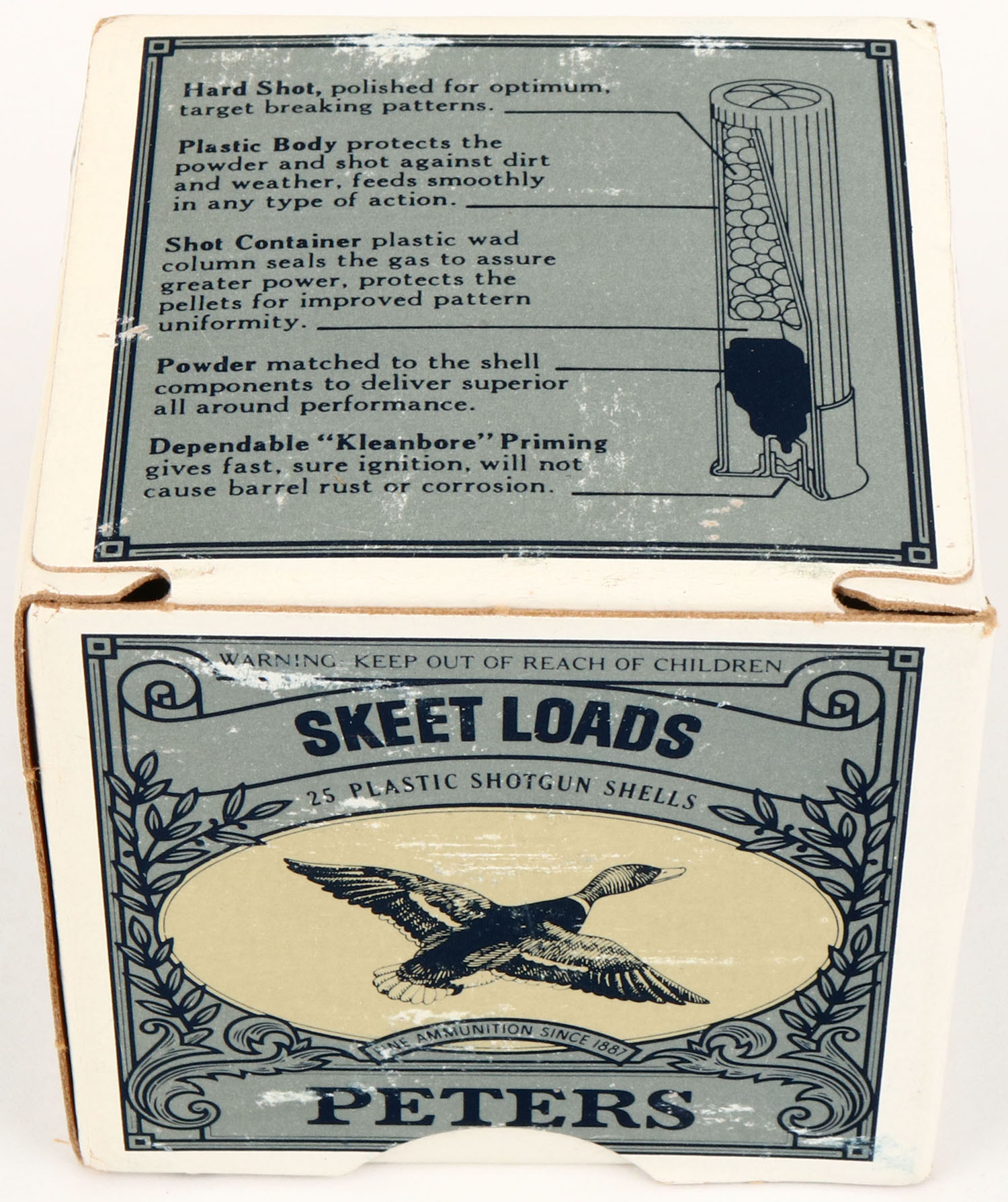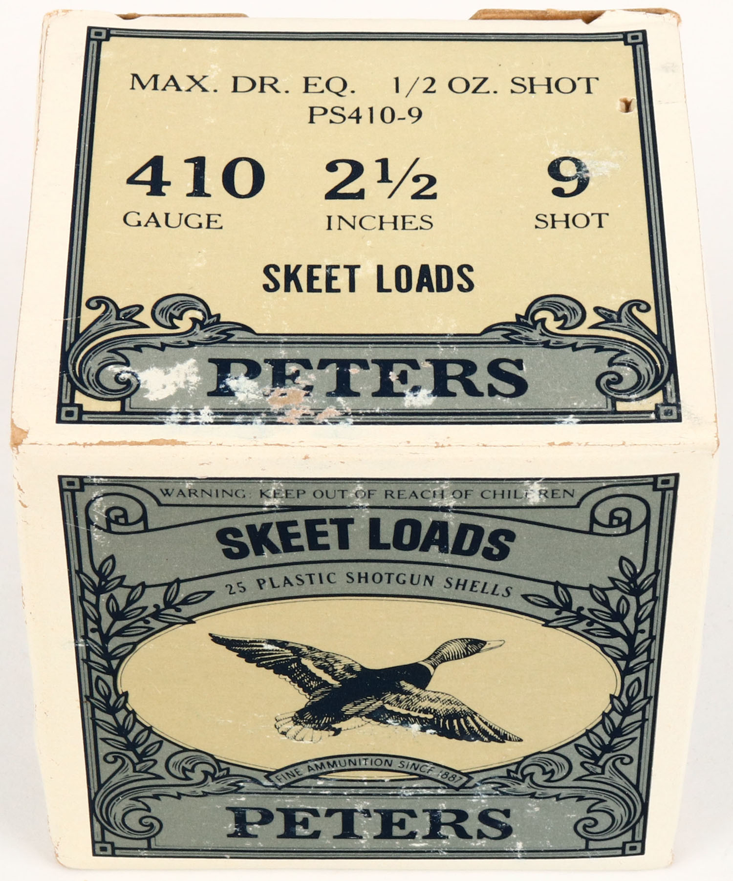 Peters Cart. Div., 410ga, 2 1/2'', 1pc., Full, shot size 9, multi colored box, box is very solid, shells are very good. Grade: Excellent + - Value: 10 to 40