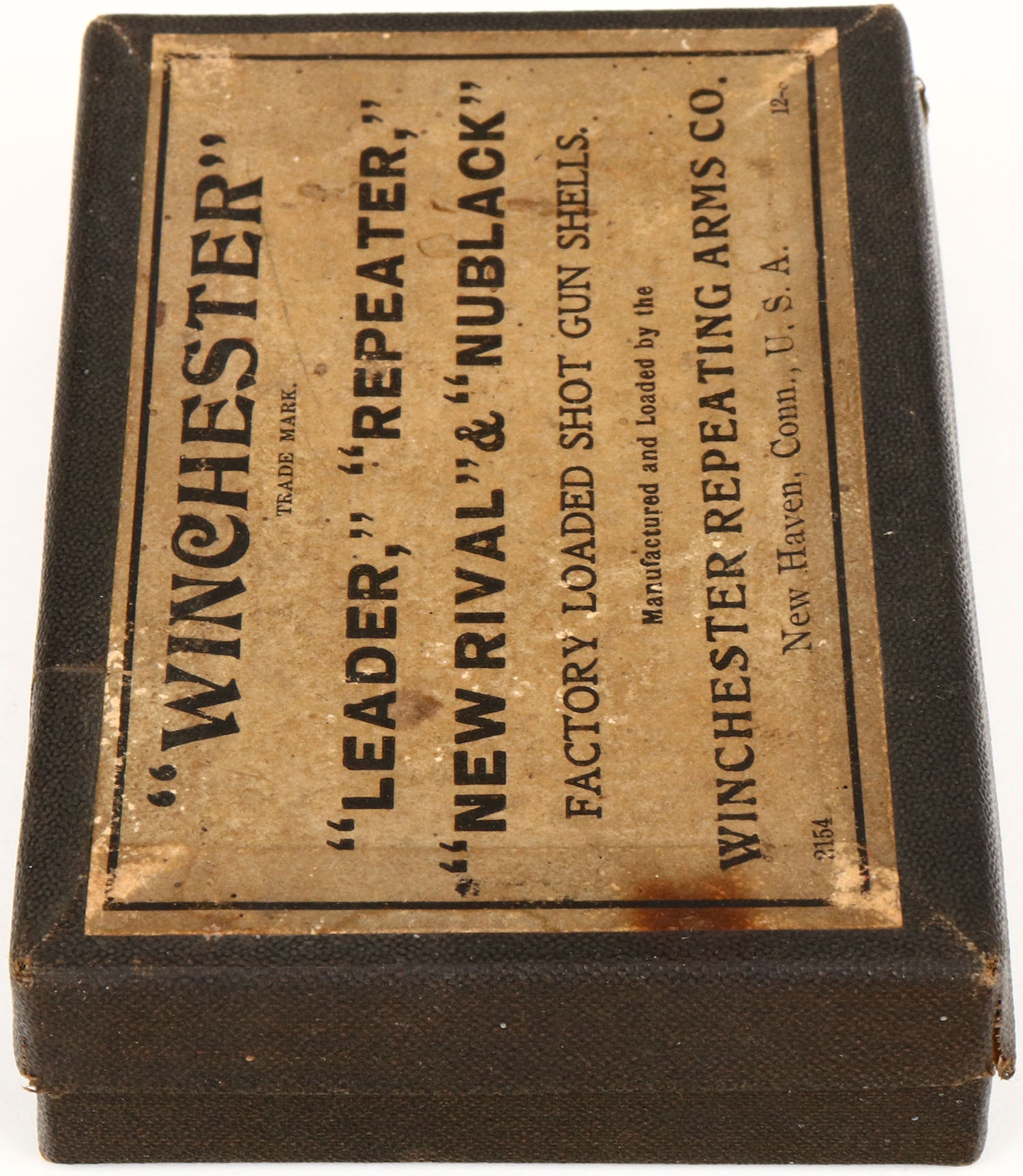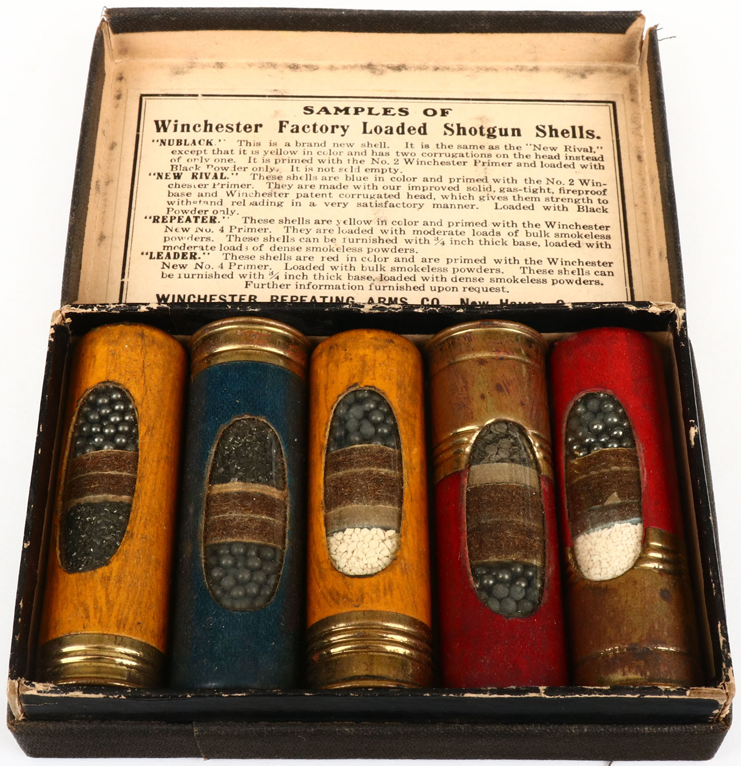 Winchester, Salesman Sample Shotshell box, 2pc., black box with buff label with black print, box is marked Leader, Repeater, New Rival, Nublack, Full and correct, five Window shells are in great shape, box is solid. Grade: Excellent - Value: 100 to 400