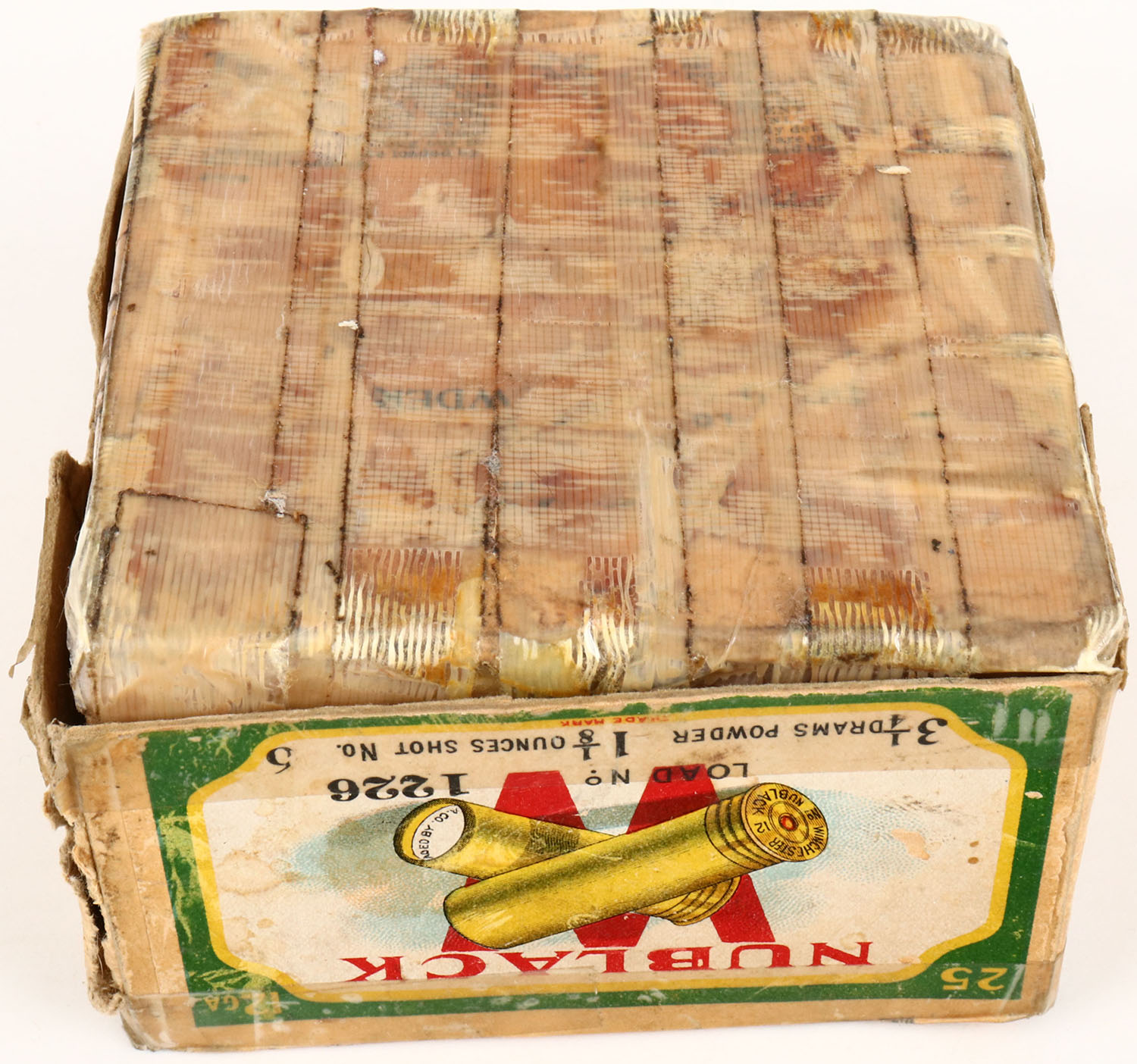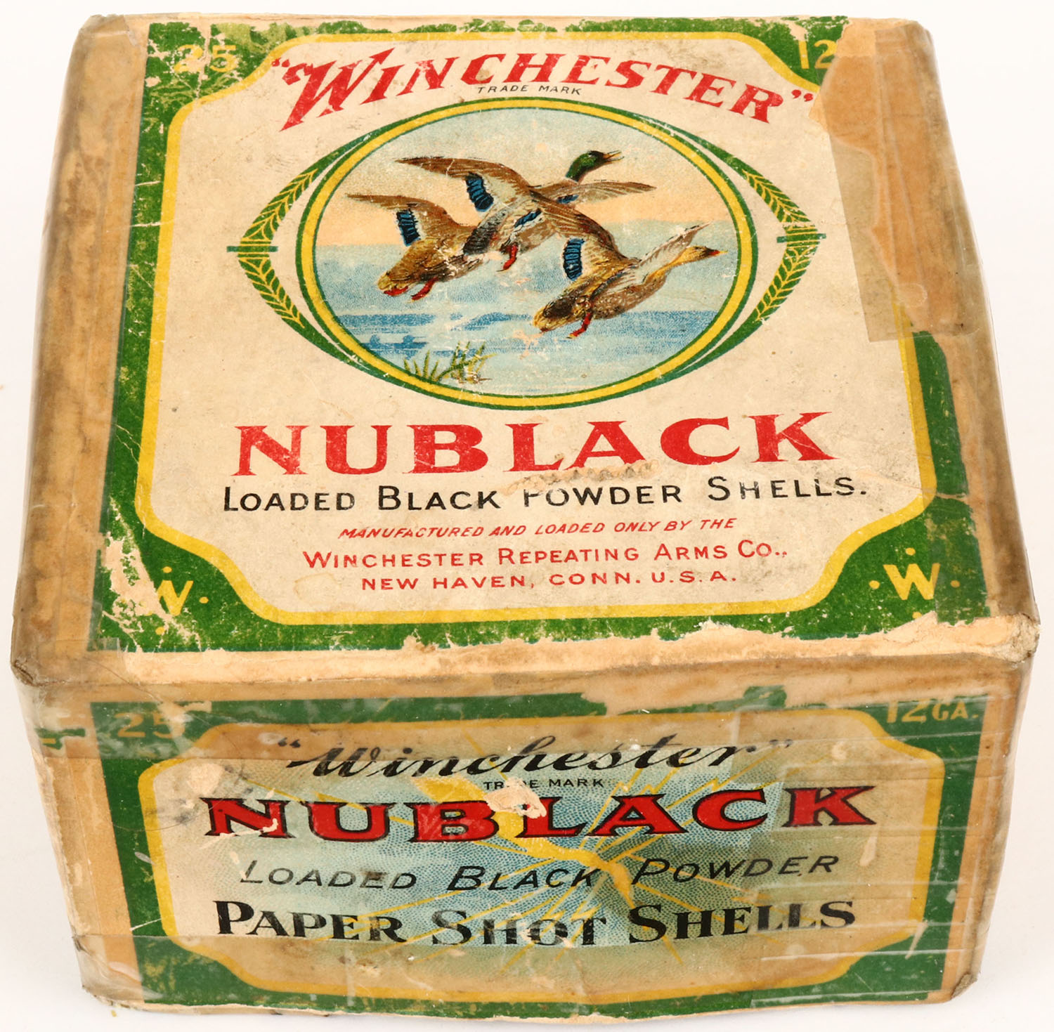 Winchester, NUBLACK, 12ga, 2pc., Full, shot size 6, buff box with multi-colored label that pictures three mallards flying over water, Yellow shells on one side panel, Box has seam splits with tape repair, light age soiling, and good colors. Shells are very good. Grade: Very Good + - Value: 50 to 200