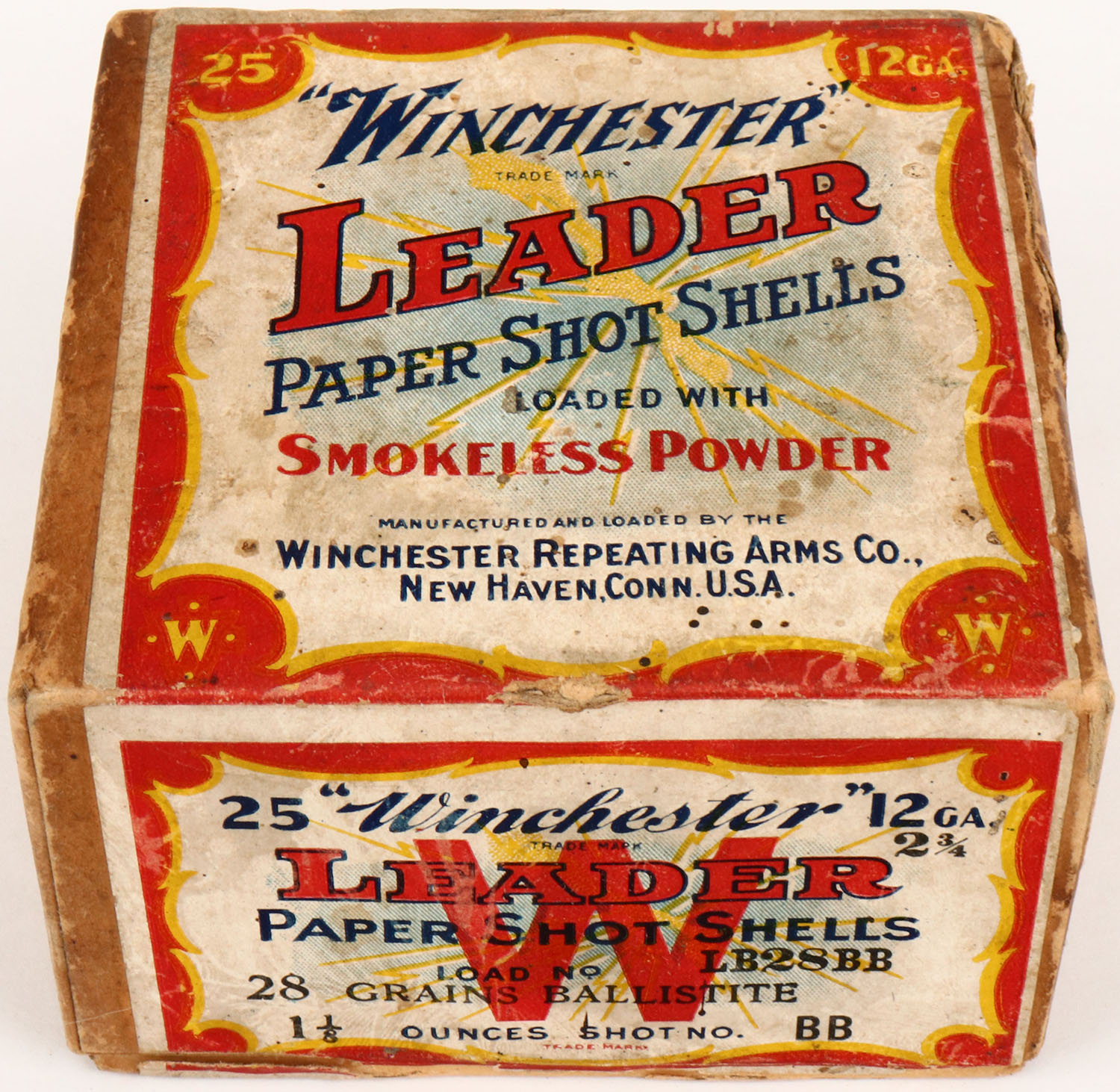 Winchester, LEADER, 12ga, 2pc., FULL, shot size BB, Buff box with red, yellow, white & black label showing lightning bolt, box is very solid with light age soiling, great color to label, Shells are excellent. Grade: Excellent - Value: 100 to 400