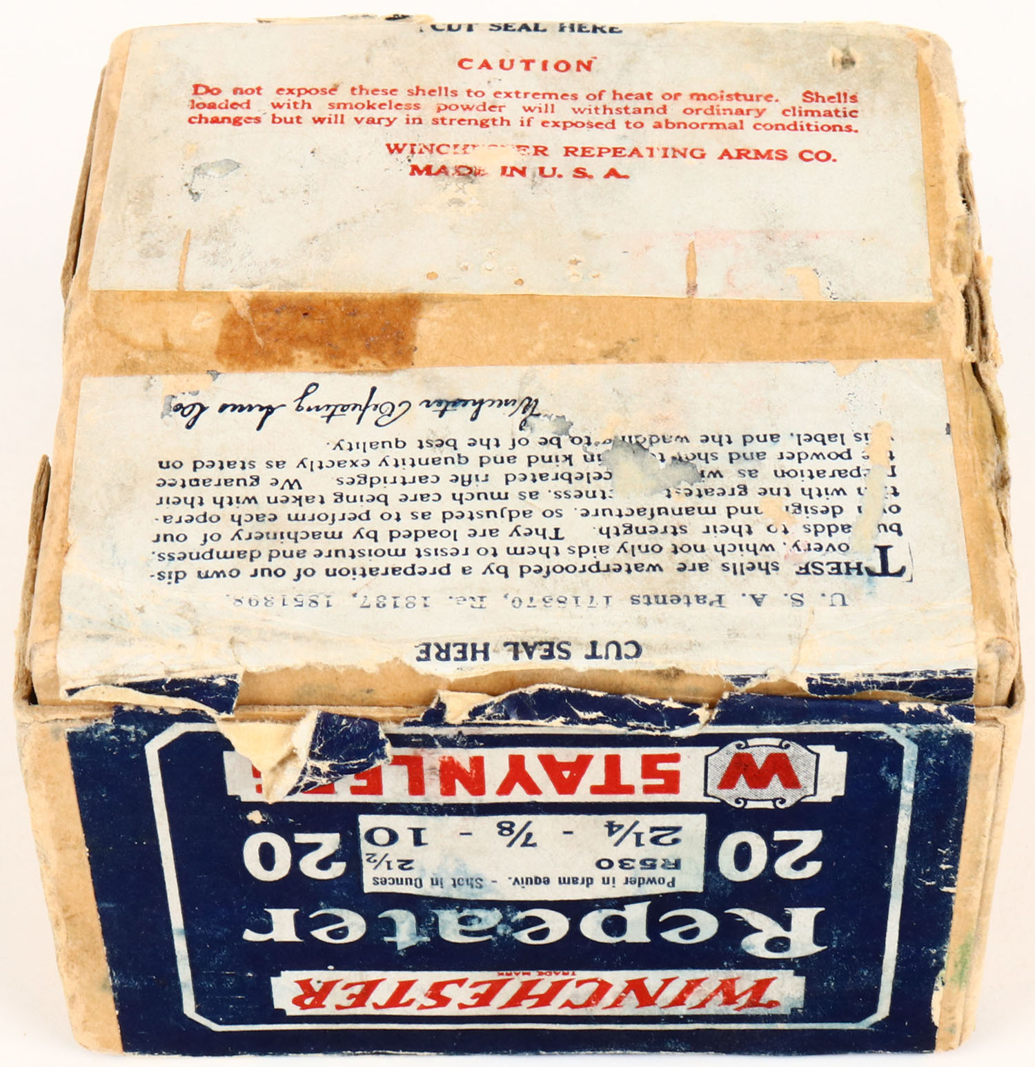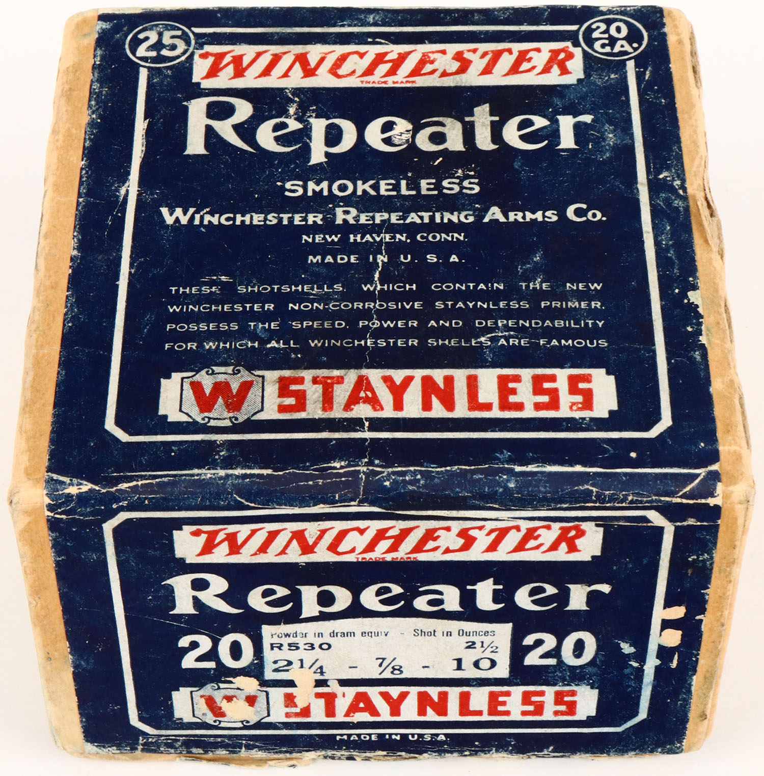 Winchester, Repeater, STAYNLESS, 20ga., 2pc., Full., shot size 10, buff box with blue, red & white label, box has shell protrusions, seam splits, with light age soiling. Shells are very good. Grade: Excellent - Value: 40 to 200