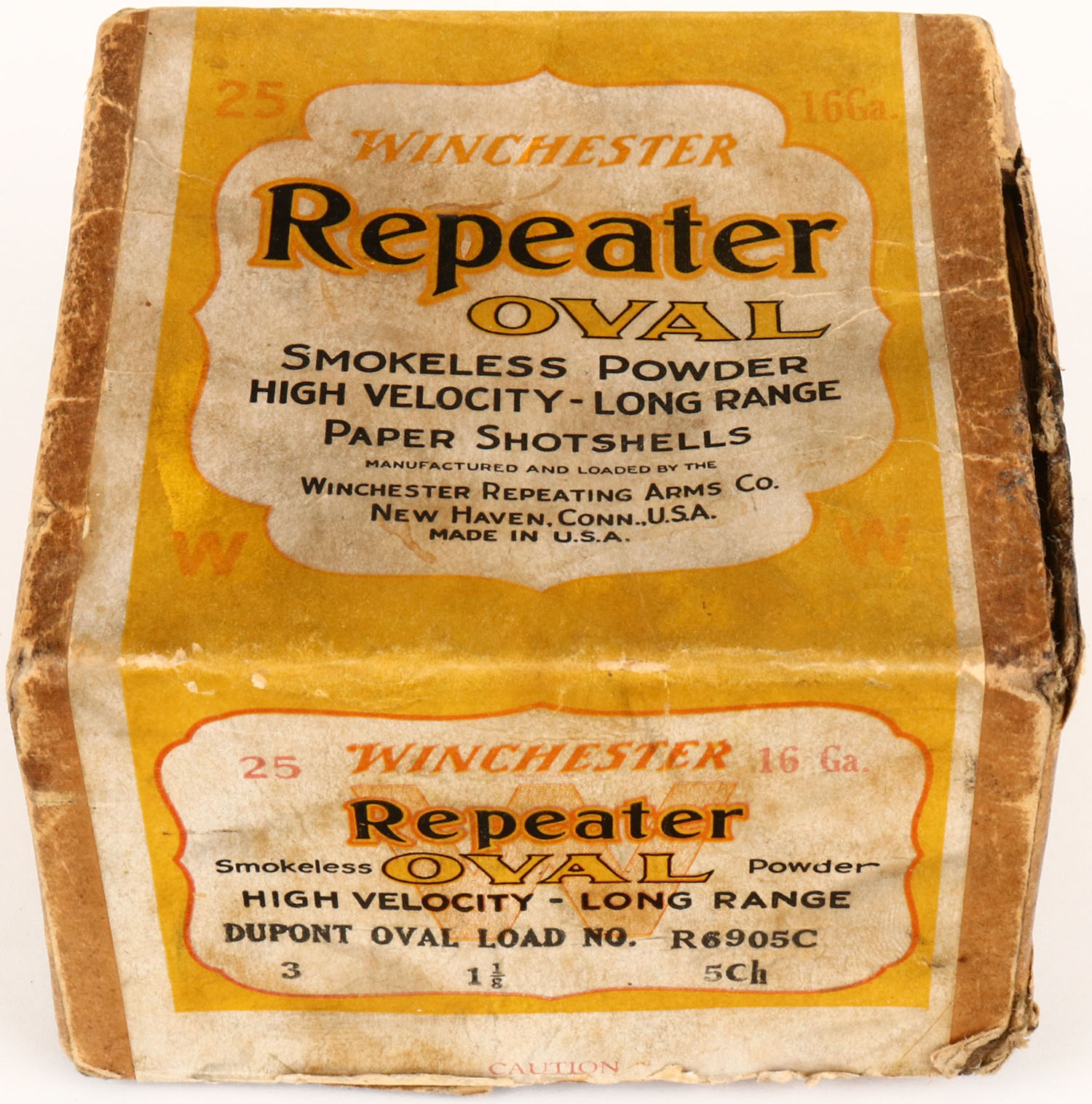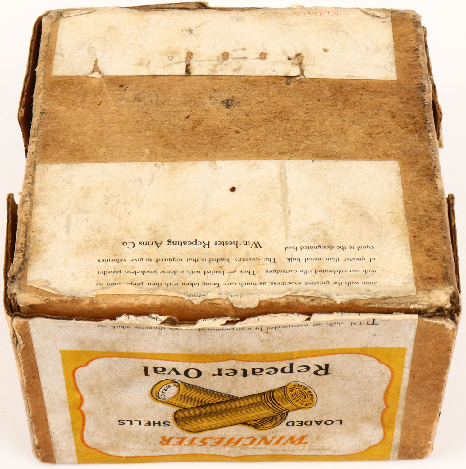 Winchester, Repeater OVAL, 16ga, 2pc., Partial 10rds, shot size 7 1/2Ch, Buff box with yellow, white & red label, box has seam split with light soiling and fading. Grade: Very Good ++ - Value: 50 to 350