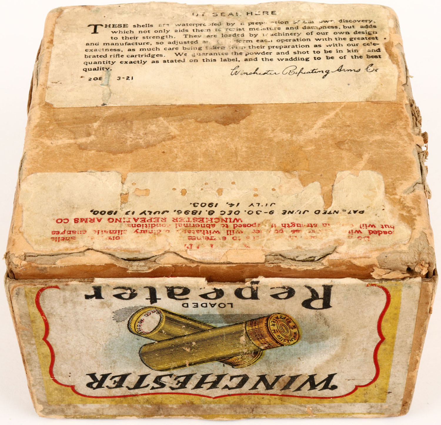 Winchester, REPEATER, 12 Gauge, 2pc., FULL, Shot Size 7 1/2, Buff box with yellow, white & red label showing lightning bolt, box has seam splits, age soiling, and shell protrusions. Shells are excellent. Grade: Very Good + - Value: 50 to 200