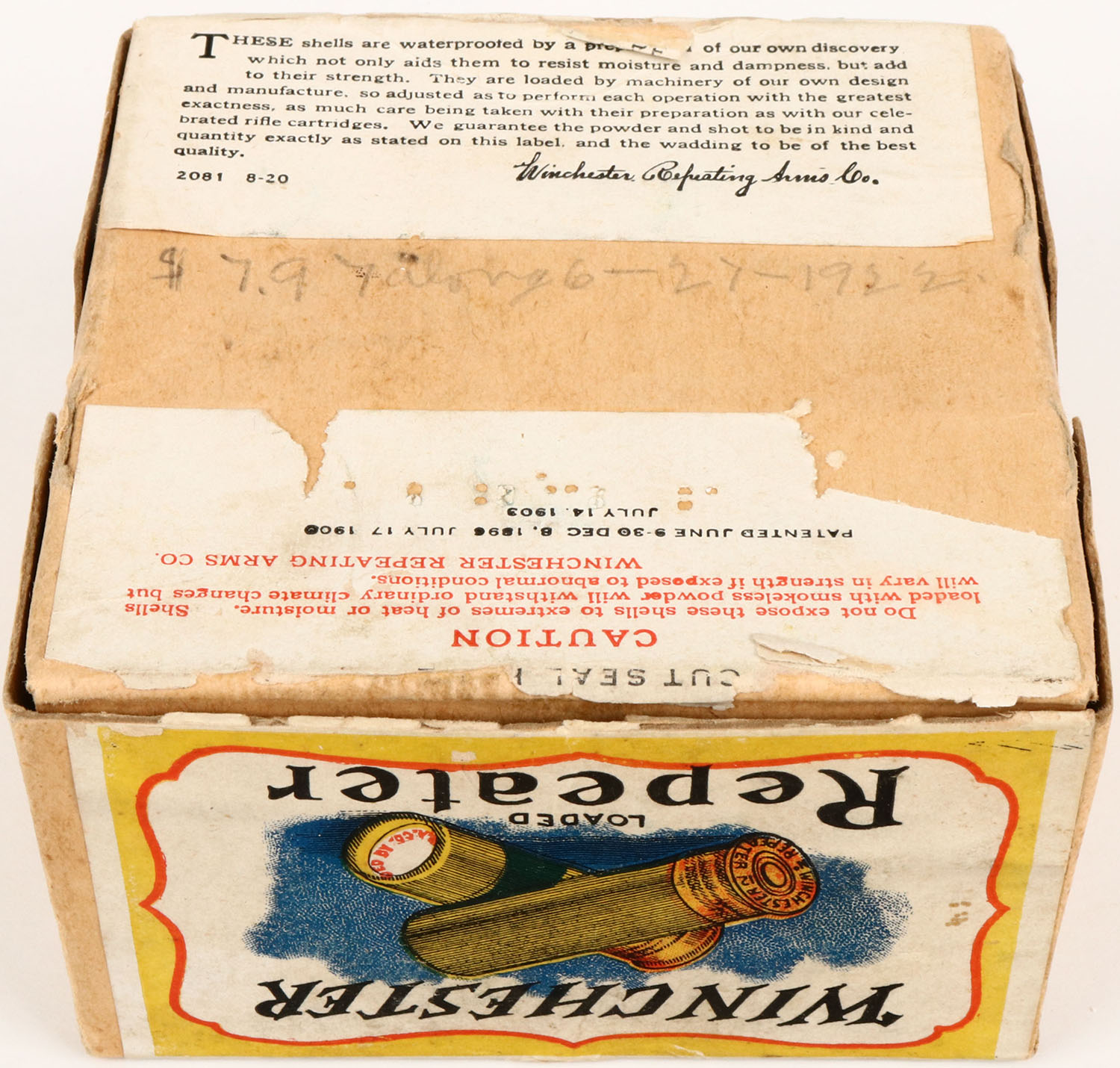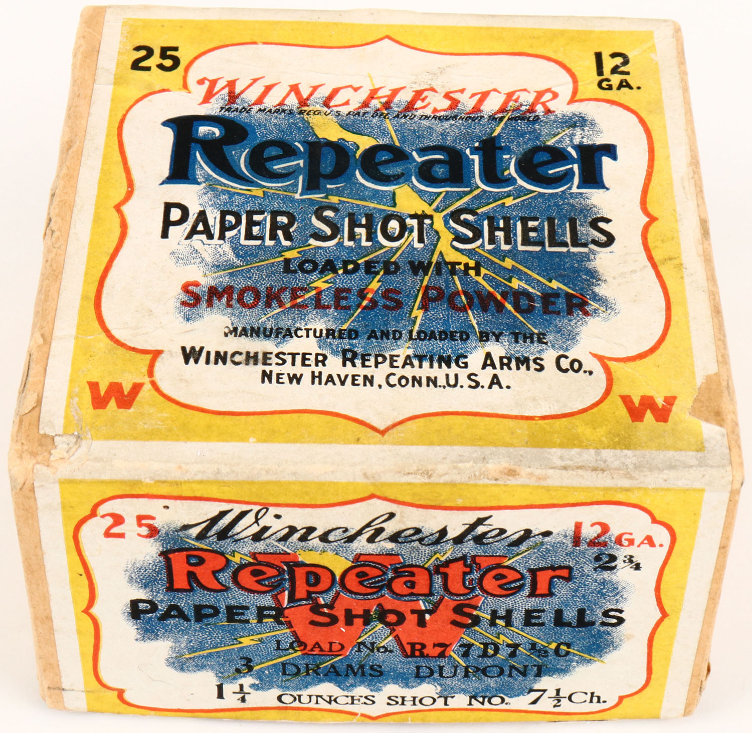 Winchester, REPEATER, 12 Gauge, 2pc., Empty., Shot Size 6, Buff box with yellow, white & red label showing lightning bolt, box is very solid with great label. Grade: Excellent + - Value: 50 to 200