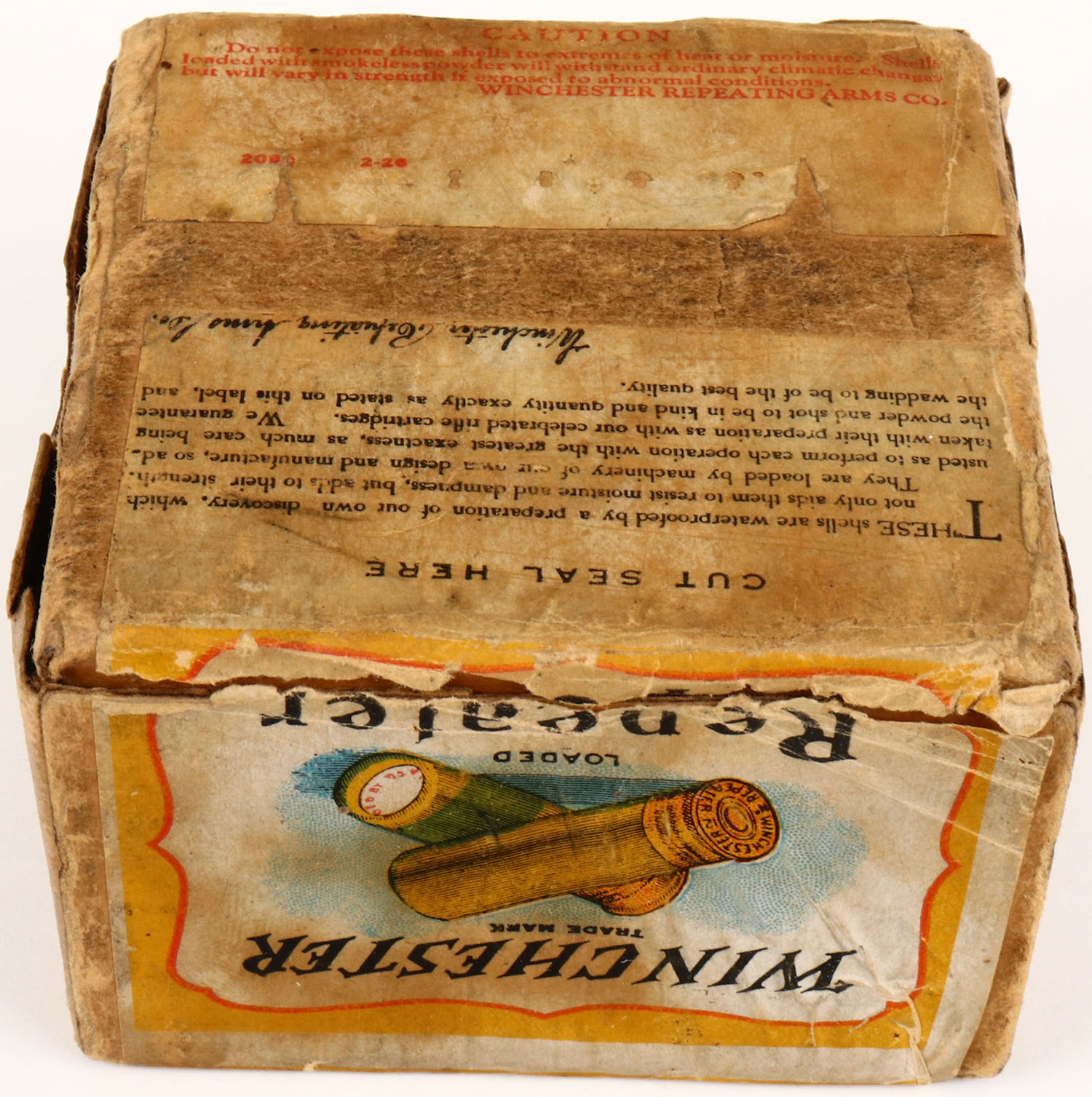Winchester, REPEATER, 20 Gauge, 2pc., Full, Shot Size 2 Ch, Buff box with yellow, white & red label showing lightning bolt, box is solid with shell protrusions, and age soiling, Shells are excellent. Grade: Very Good - Value: 50 to 200