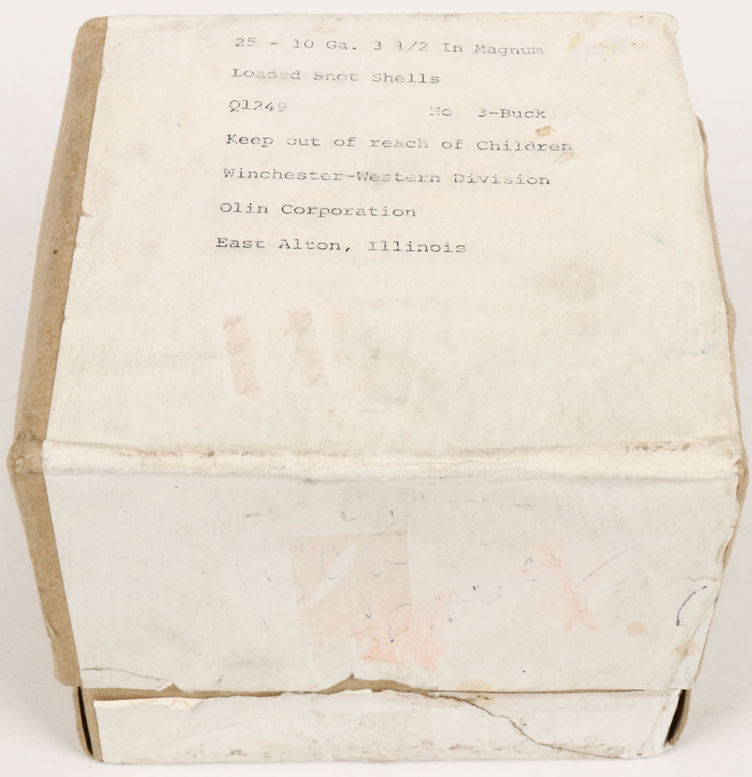 Winchester, Olin Corporation, 10ga., 2pc., Full., shot size 3 Buck, buff box with white label, box is solid, Shells are excellent. Grade: Excellent - Value: 30 to 150
