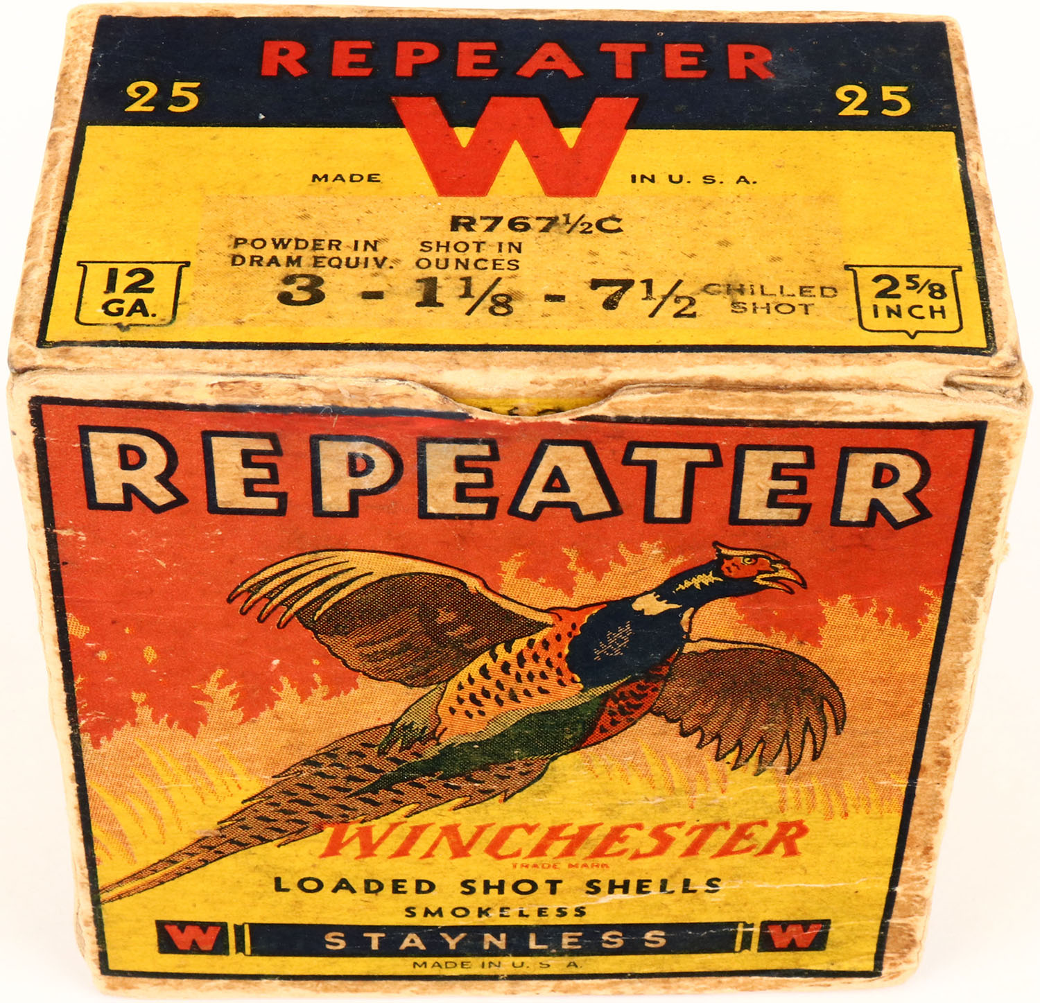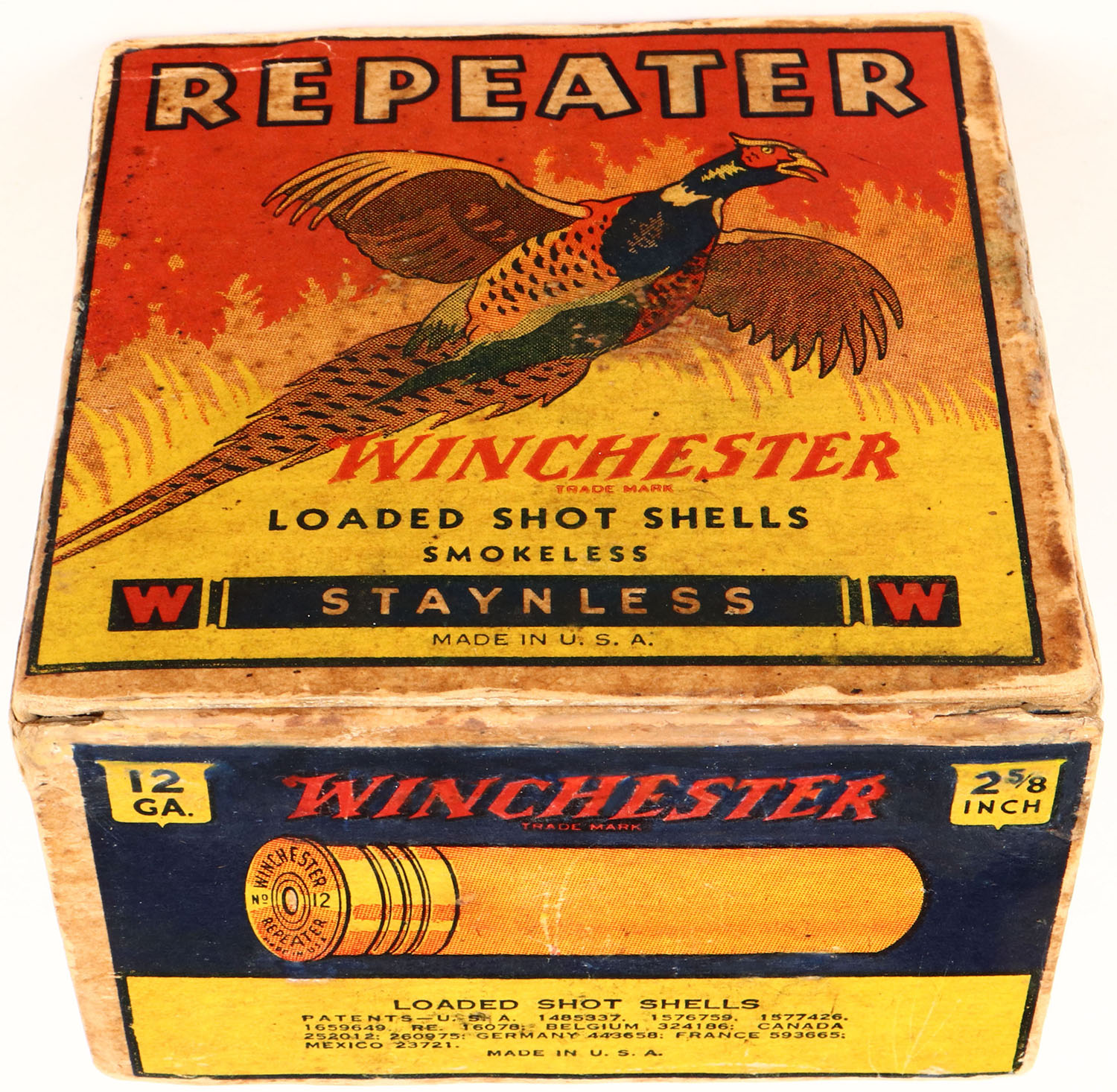 VERY RARE Winchester, PHEASANT BOX, REPEATER, 12 GAUGE!, 1pc., FULL, Multi-colored PHEASANT BOX!!! Loading: R7671/2C - 1 1/8 - 7 1/2C, 2 5/8 inch, box is solid with light age soiling, very nice colors, shells are very good, HARD TO FIND BOX! Grade: Excellent - Value: 1000 to 5000