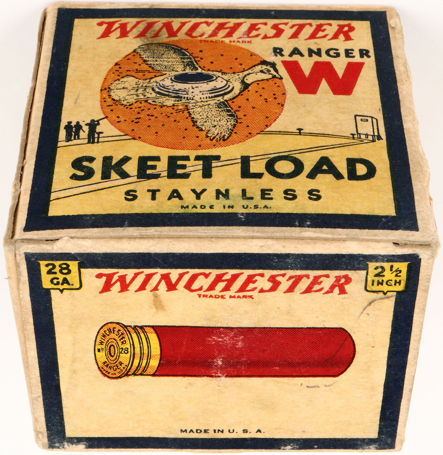Winchester, RANGER SKEET LOAD WESTERN MINIMAX, 28ga, 1pc., Full, White, blue & red box that pictures flying Quail with skeet in body & shot all around, Staynless, 2 1/2'', Loading: 1 3/4 Drams 5/8 Oz. 9 Chilled Shot, Box is very solid with nice colors, Shells are poor. RARE BOX. Grade: Excellent - Value: 200 to 600