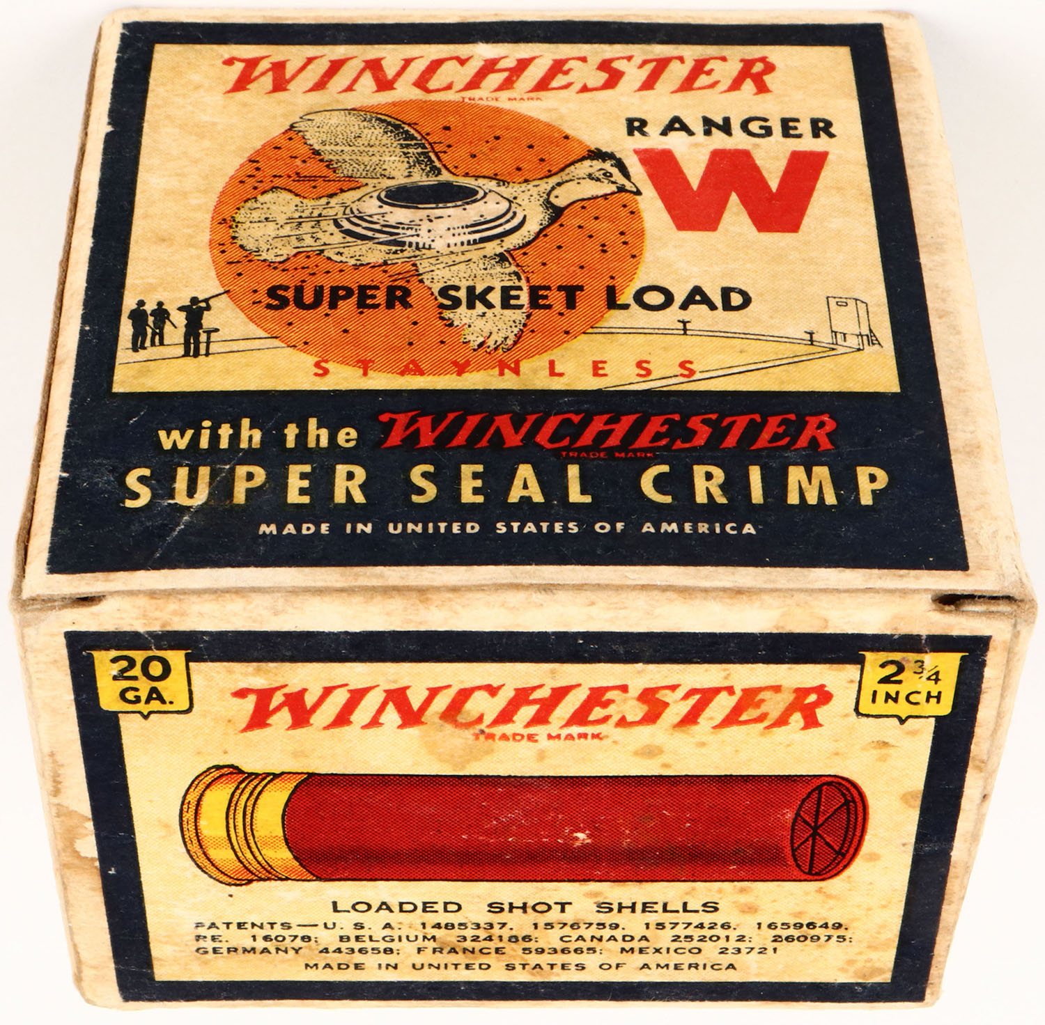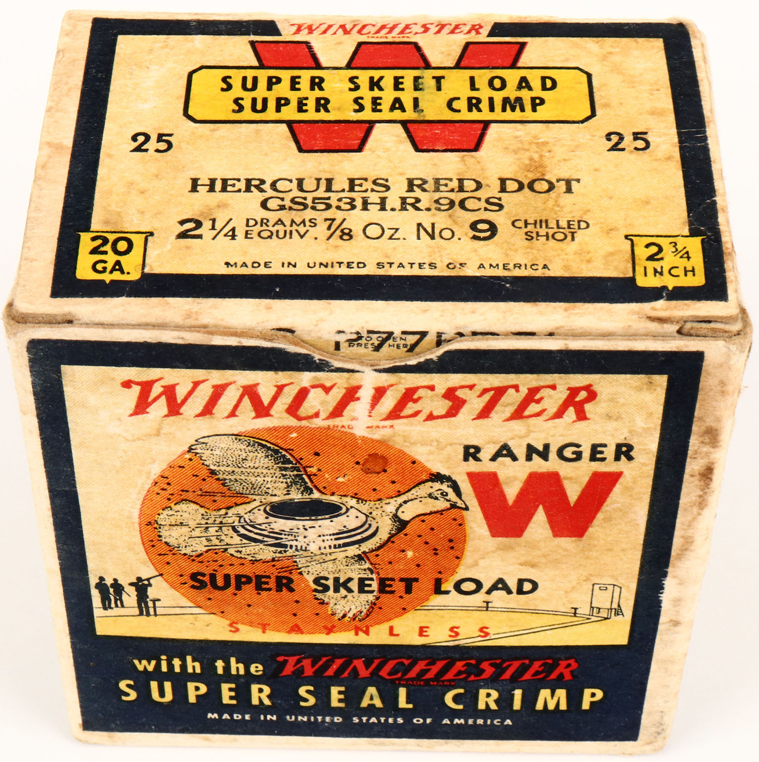 Winchester, RANGER SUPER SKEET LOAD, Hercules Red Dot, 20ga, 1pc., Partial 24rds, White, blue & red box that pictures flying Quail with skeet in body & shot all around, Staynless, 2 3/4'', Loading: 2 1/4 Drams 7/8 Oz. 9 Chilled Shot, Box has age soiling with light edge wear and inside flap is torn, RARE BOX Shells are fair. Grade: Very Good ++ - Value: 40 to 200