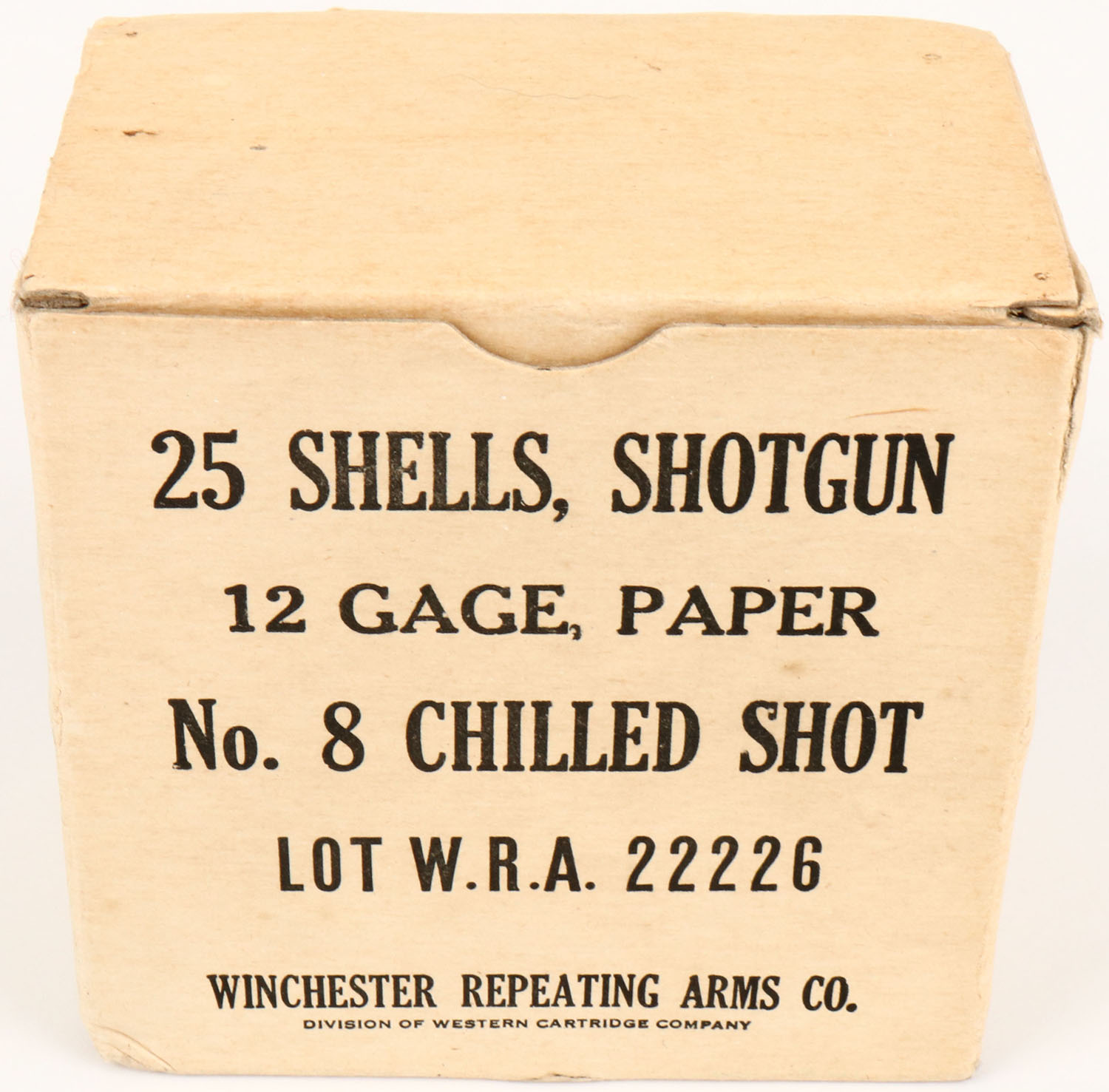 Winchester, Paper Shot Shells, 12ga., 1pc., Full, shot size 8 Chilled Shot, buff box with buff & black label, Military lot W.R.A. 22226, shells are very good. Grade: Excellent + - Value: 30 to 200