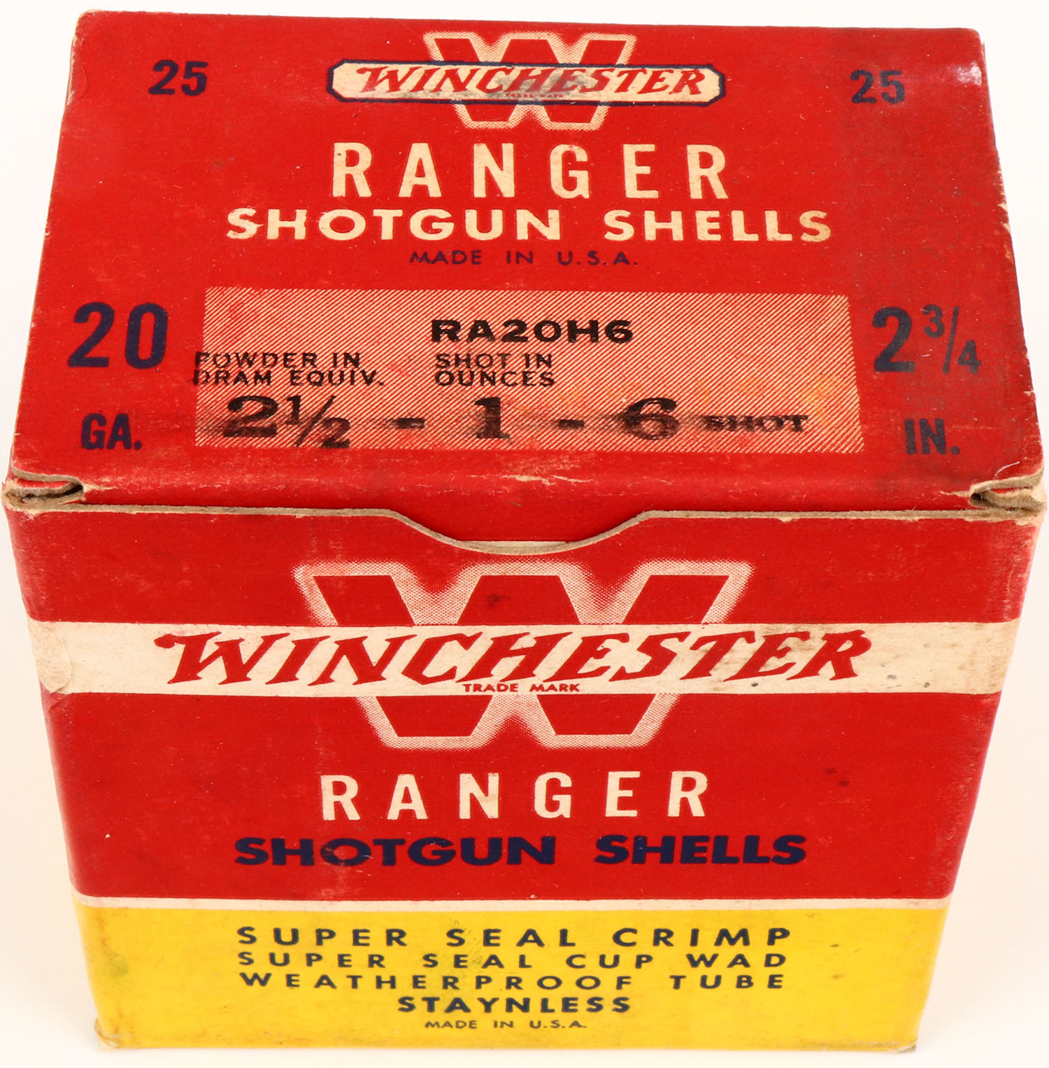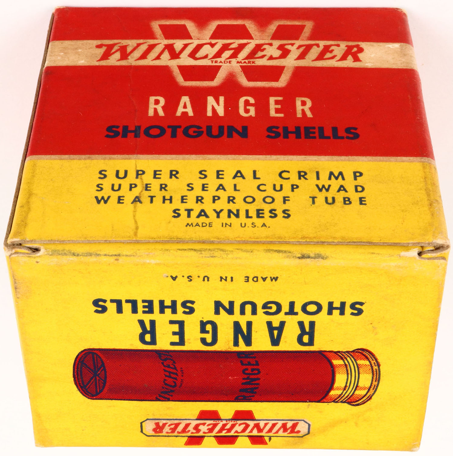 Winchester, Ranger, 12ga., 1pc., Full, shot size 6, red, white & yellow box, Box is very solid with nice colors has light age soiling, shells are excellent. Grade: Excellent + - Value: 10 to 30