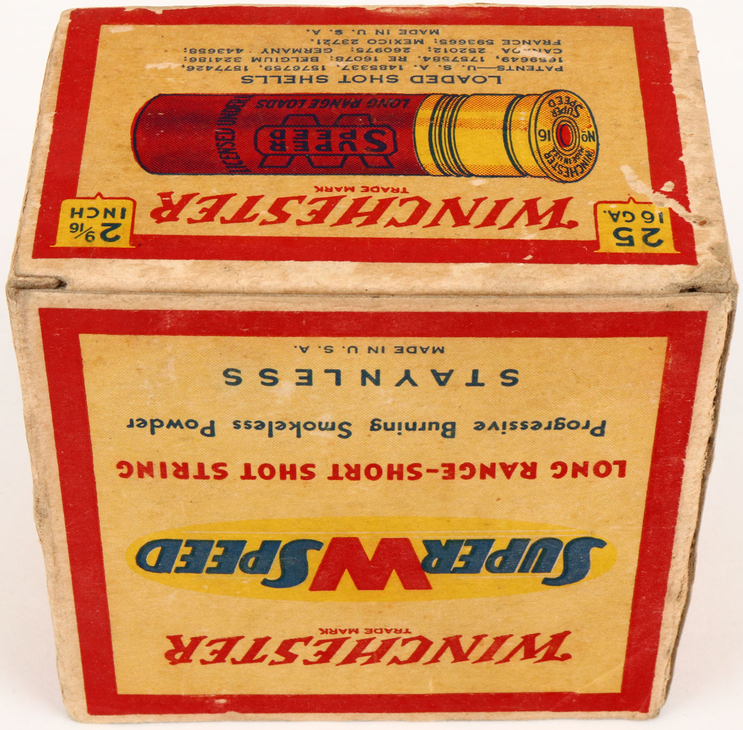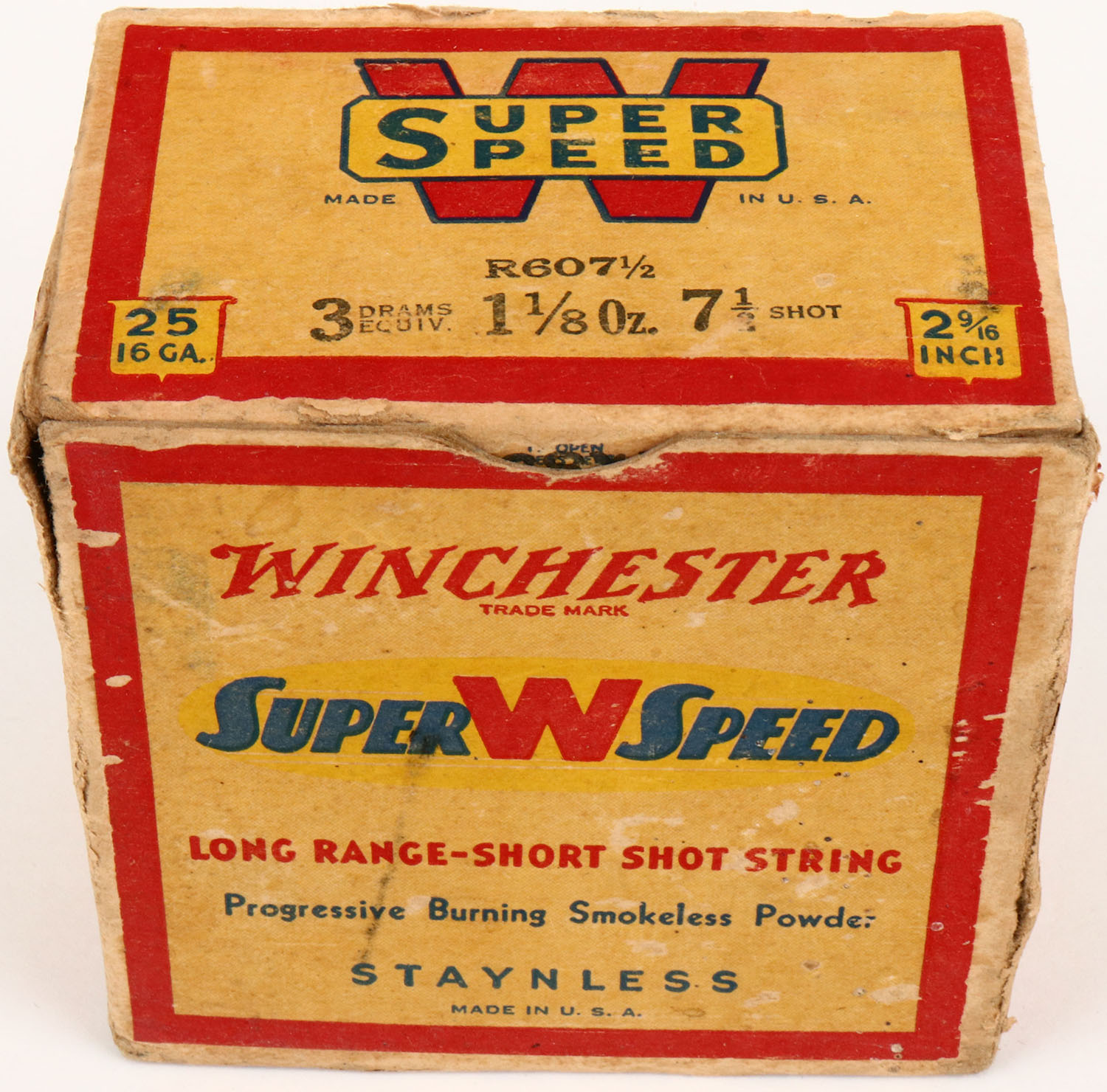 Winchester, Super W Speed, 12ga., Staynless, 2 9/16'', 1pc., Full, shot size 7 1/2, cream red, blue and yellow box, box is solid with small seam split, has very good colors, top flap is torn, shells are very good. Grade: Excellent - Value: 10 to 40