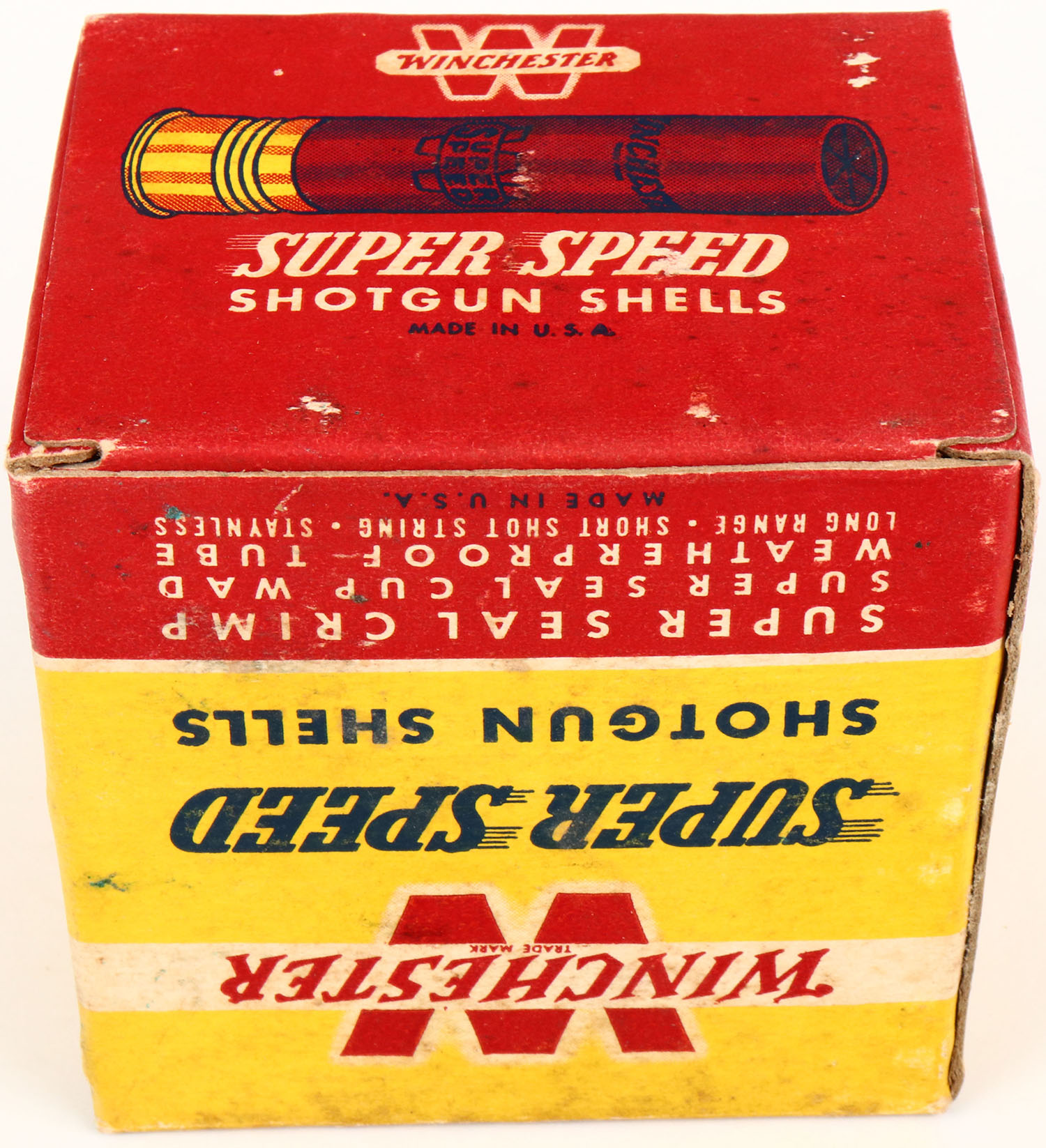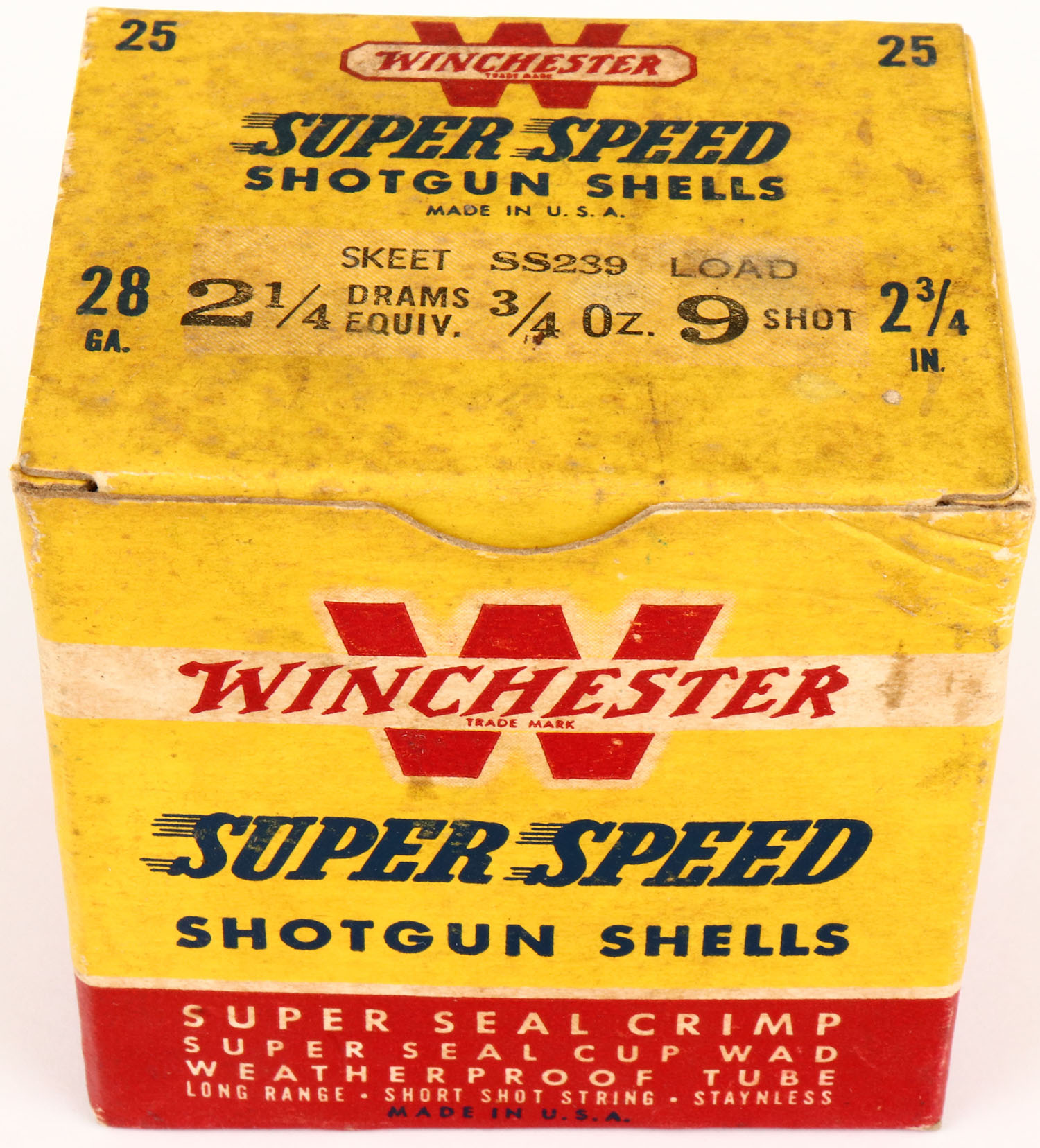 Winchester, Super Speed, 28ga., 1pc., Full., 2 3/4'', shot size 9, red, yellow & blue box, box is very solid with age soiling, shells are very good. Grade: Very Good ++ - Value: 16 to 30