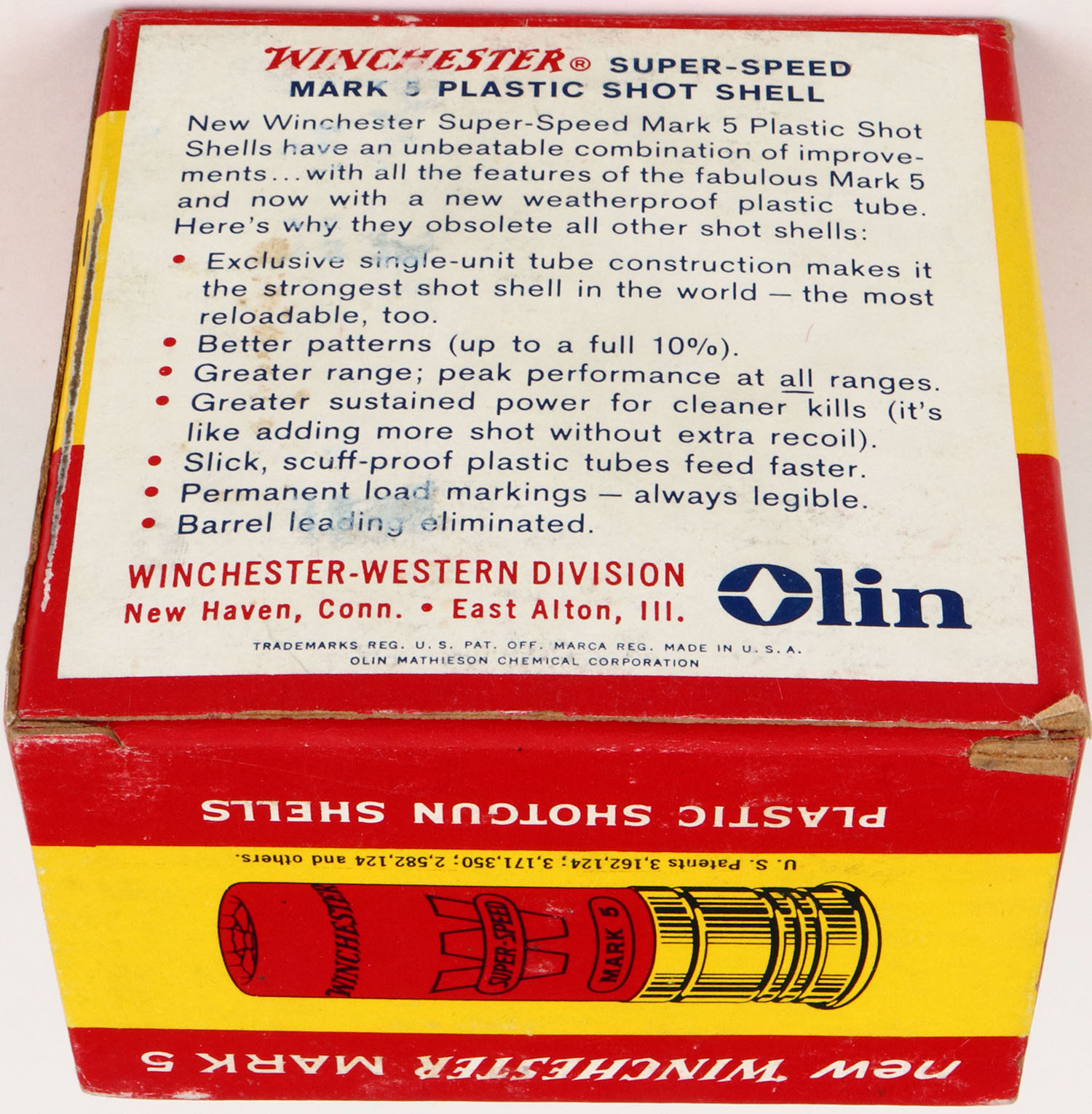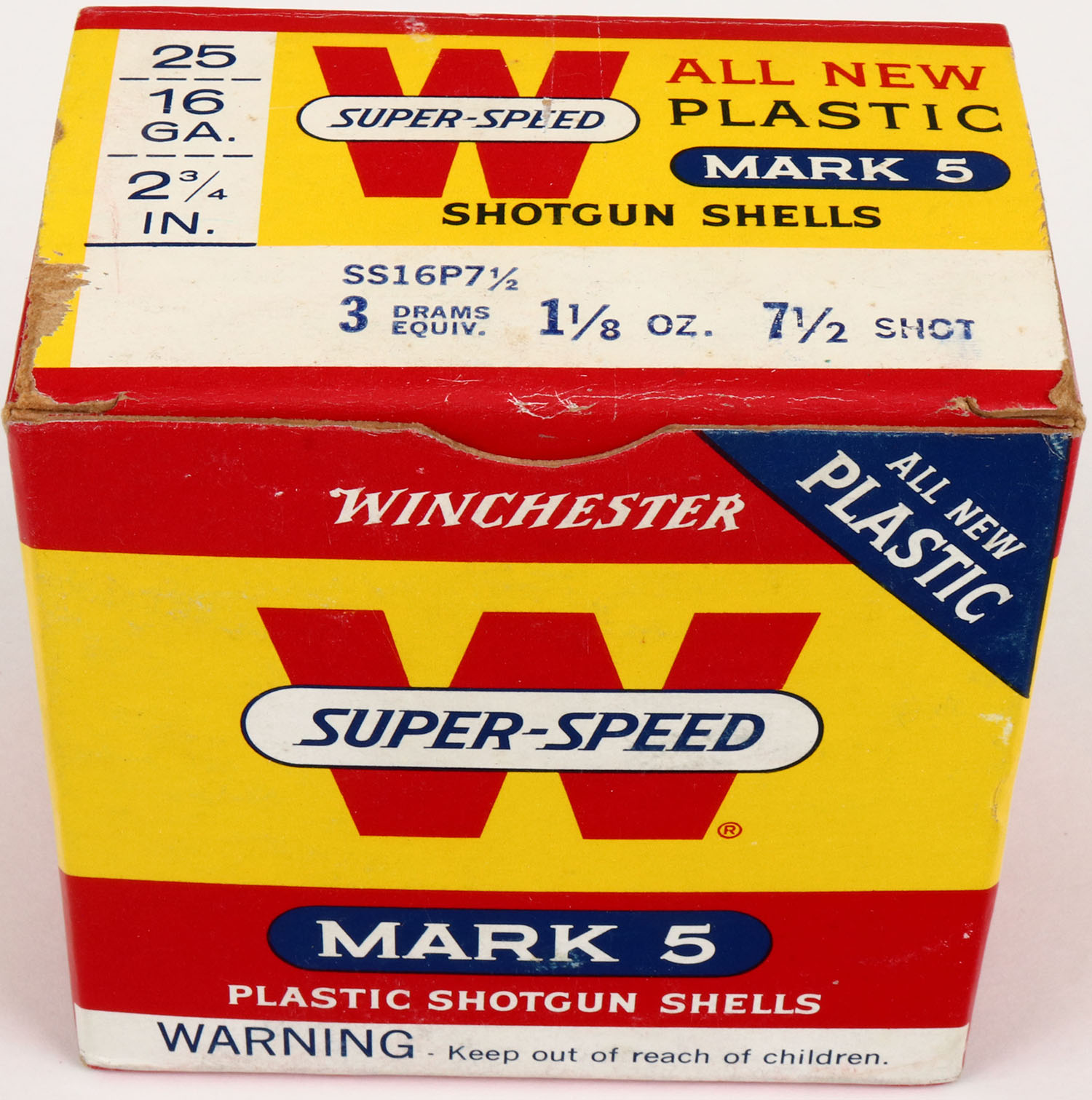 Winchester, SUPER SPEED NEW MARK 5, 16ga., 1pc., Full, shot size 7 1/2, red, blue and white box, box is very solid with great colors, shells are excellent. Grade: Excellent ++ - Value: 10 to 30