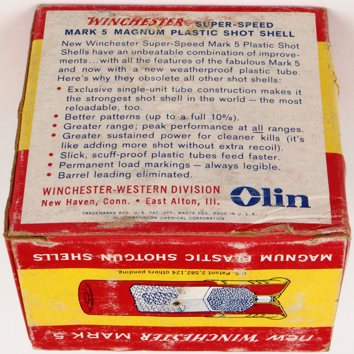 Winchester, Super Speed Mark 5, 16 ga., 2 3/4'', 1pc., Full, shot size 4 Magnum, yellow, blue & red box, box is solid with light soiling and light shell protrusion, shells are excellent. Grade: Excellent + - Value: 10 to 30